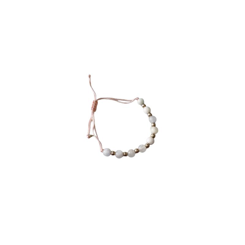 Subtelna,  piękna biżuteria wykonana ze złota pr. 585. Głównym motywem ozdobnym bransoletki są okrągłe białe kamienie jubilerskie , założone na  regulowany rzemyk oraz złote kuleczki. Bransoletka ma regulowaną długość dzięki czemu łatwiej dopasować jej rozmiar do nadgarstka. To idealne połączenie klasyki z nowoczesnymi trendami mody. Doskonale sprawdzi się jako wyjątkowy prezent.