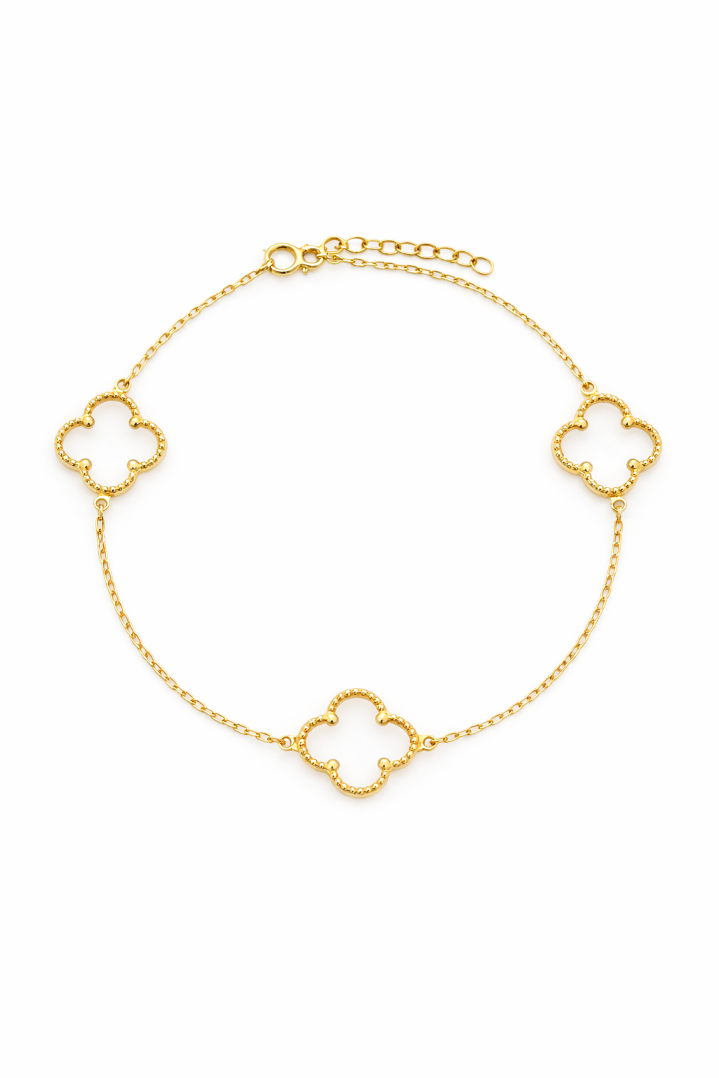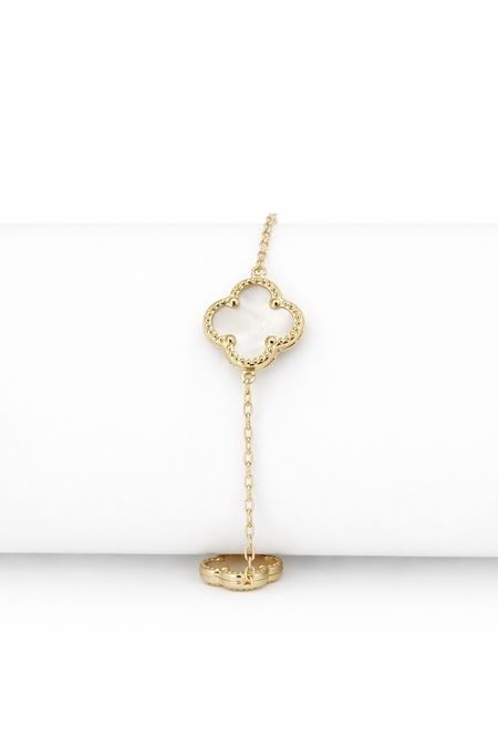 Bransoletka została wykonana z wysokiej jakości żółtego złota o próbie 585 (14K). Ma delikatną, ozdobną formę opartą na cienkim łańcuszku o splocie ankier, uzupełnioną dekoracyjnymi elementami w kształcie koniczyn rozmieszczonymi na całej długości. Całość prezentuje się lekko i subtelnie, zachowując estetyczny i elegancki wygląd.