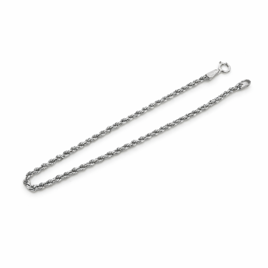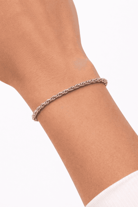 Bransoletka została wykonana z wysokiej jakości białego złota próby 585 (14K). Jej forma opiera się na klasycznym splocie typu kordel, który charakteryzuje się skręconą, spiralną strukturą nadającą biżuterii subtelnego połysku i eleganckiej wyrazistości.