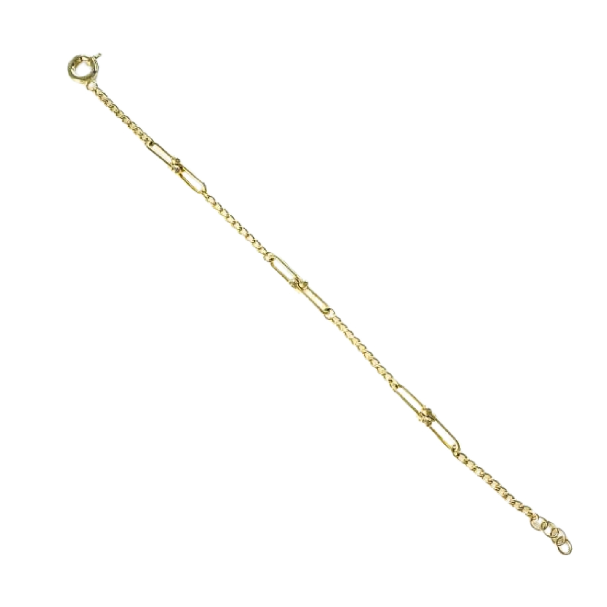 Bransoletka wykonana z wysokiej jakości złota próby 585 (14K). Jej forma opiera się na mieszanym splocie – delikatne, drobne ogniwa przeplatają się z wydłużonymi elementami, tworząc subtelną, a jednocześnie wyrazistą kompozycję. Całość prezentuje się lekko i elegancko, zachowując harmonijny charakter.