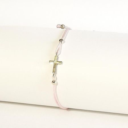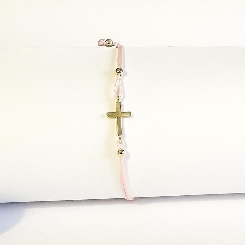 BRANSOLETKA SZCZĘŚCIA, RÓŻÓWY SZNUREK, ZŁOTY KRZYŻ 0,89g 14K