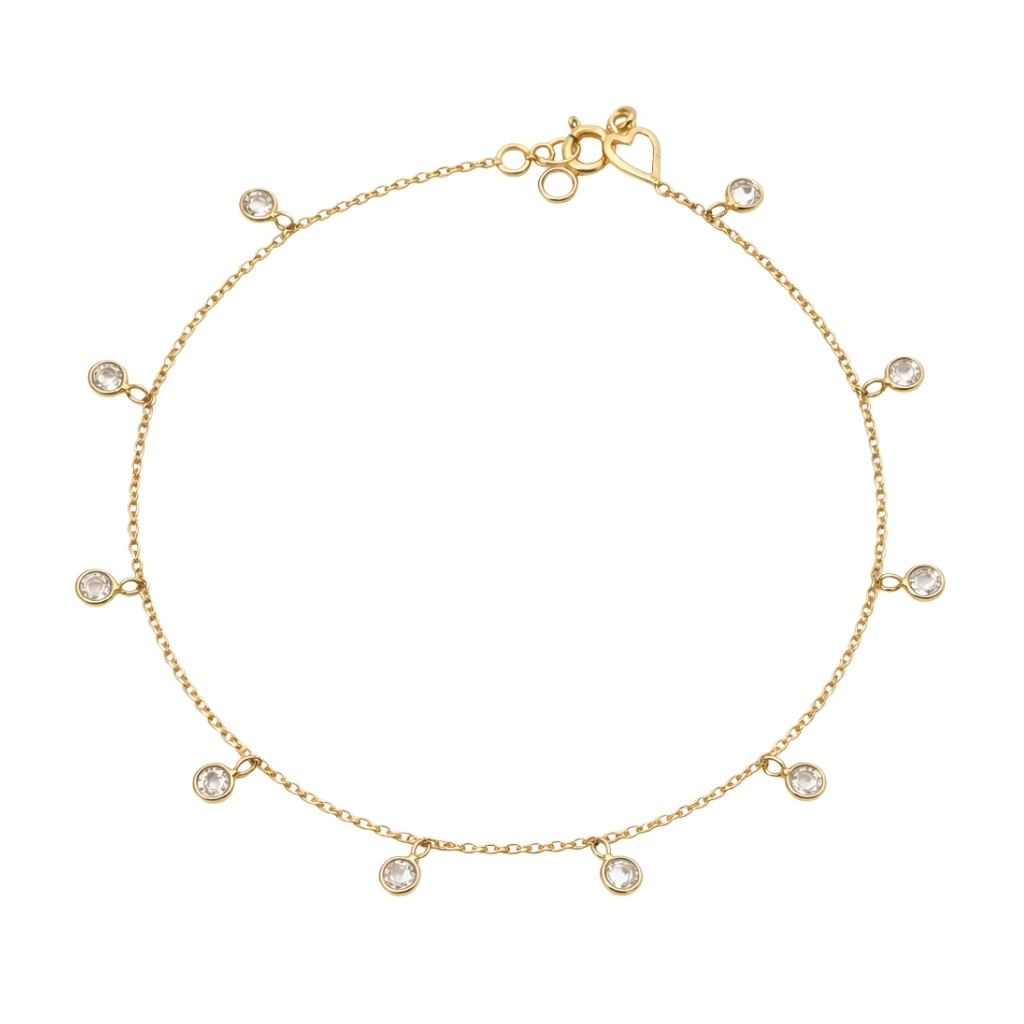 Bransoletka z wiszącymi cyrkoniami w pełnej oprawie to subtelna i elegancka propozycja dla kobiet ceniących ponadczasowy styl. Delikatny łańcuszek został ozdobiony drobnymi, swobodnie poruszającymi się elementami, które pięknie odbijają światło i nadają biżuterii lekkości.