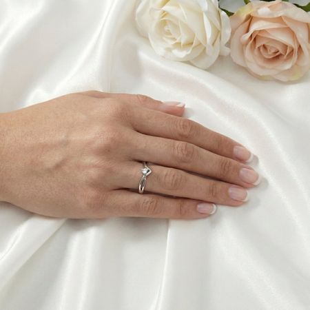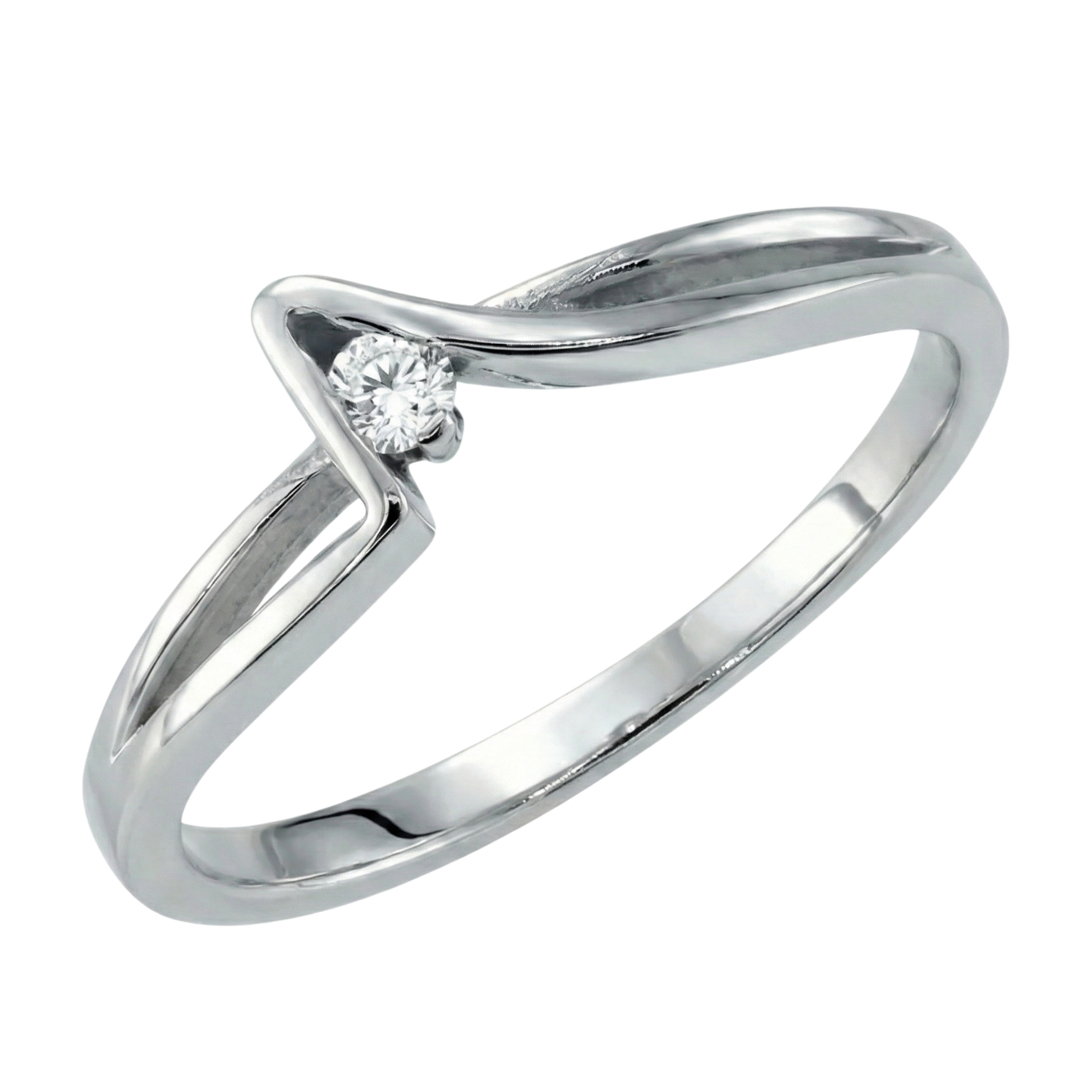 Złoty pierścionek z brylantem został wykonany z najwyższej jakości białego złota próby 585 (14K) oraz brylantu SI/H o masie 0,05 ct. Pierścionek charakteryzuje się smukłą i delikatną formą o nowoczesnym charakterze. Centralnym punktem jest osadzony niewielki brylant, trzymany w asymetrycznej oprawie, która płynnie łączy się z obrączką. Całość prezentuje się minimalistycznie, tworząc przy tym szykowny efekt.