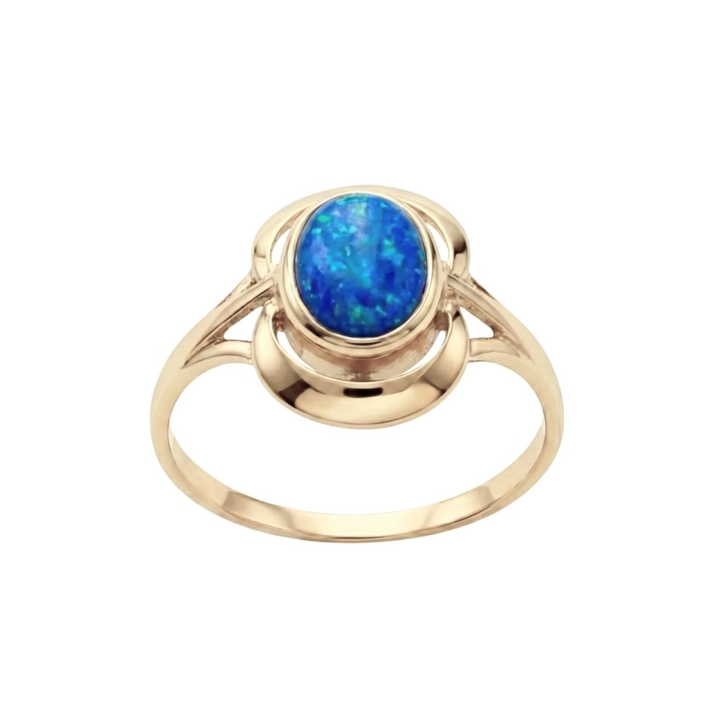 Pierścionek został wykonany z wysokiej jakości żółtego złota próby 585 (14K). Centralnym elementem jest efektowny, niebieski kamień o głębokiej, wielotonowej barwie, który przyciąga wzrok i nadaje całości wyjątkowego charakteru. Gładka, pełna oprawa podkreśla intensywność koloru, a delikatnie wyprofilowana obrączka nadaje harmonii i lekkości.