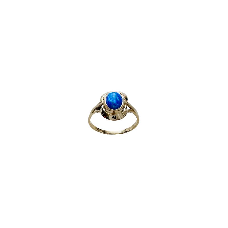 Duży pierścionek wykonany z żółtego złota pr. 585 z centralnie osadzonym niebieskim oczkiem. Pierścionek cudownie prezentuje się na palcu. Polecamy w szczególności jako prezent na dzień mamy, rocznicę ślubu czy urodziny.