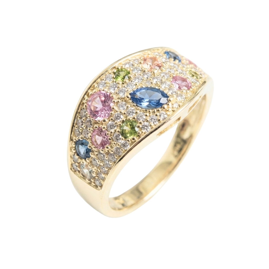 EFEKTOWNY PIERŚCIONEK Z PASTELOWYMI CYRKONIAMI