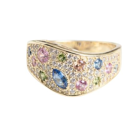 Pierścionek wykonany ze złota pr. 585 ozdobiony kolorowymi cyrkoniami. Pierścionek wykonany ze złota pr. 585 wysadzony dużymi cyrkoniami o pastelowych kolorach i mniejszych białych. Piękny, duży pierścionek obok którego nikt nie przejdzie obojętnie. Pierścionek cudownie prezentuje się na palcu.