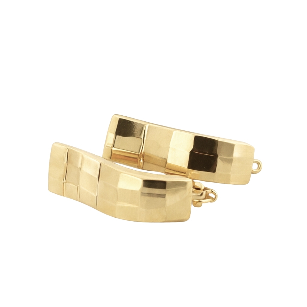 Kolczyki zostały wykonane z wysokiej jakości żółtego złota próby 585 (14K). Ich elegancka forma została podkreślona subtelną, geometryczną fakturą, która pięknie odbija światło i nadaje biżuterii nowoczesnego charakteru.
