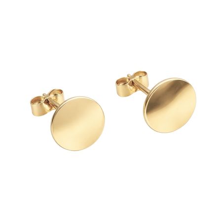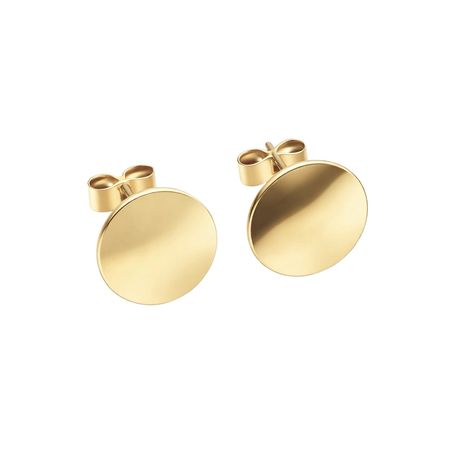 Kolczyki wykonane z żółtego złota próby 585 mają formę gładkich, okrągłych blaszek. To minimalistyczny model o nowoczesnym i ponadczasowym charakterze.