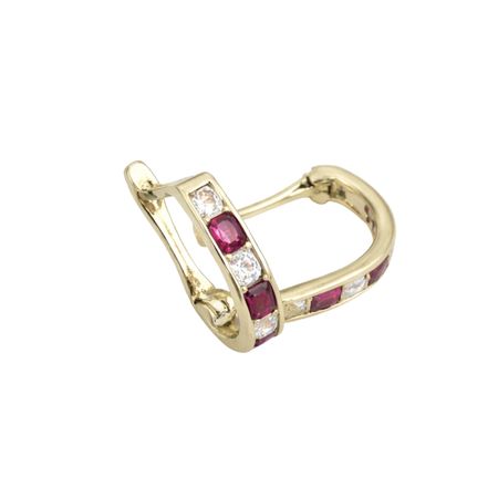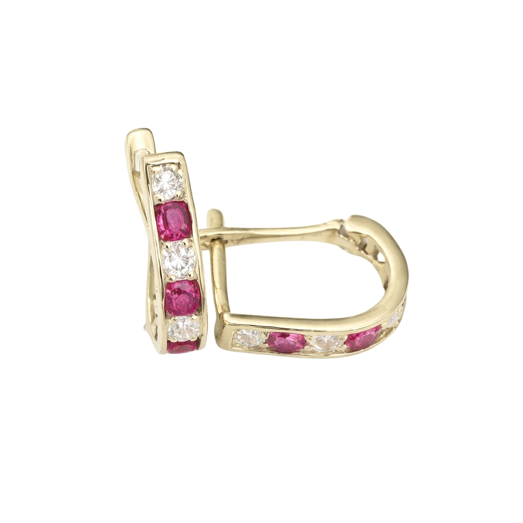 Kolczyki wykonane z żółtego złota próby 585 to klasyczny model ozdobiony naprzemiennie białymi i czerwonymi cyrkoniami. Kamienie zostały osadzone wzdłuż przedniej części kolczyka, dzięki czemu pięknie odbijają światło i nadają biżuterii wyrazistego charakteru.