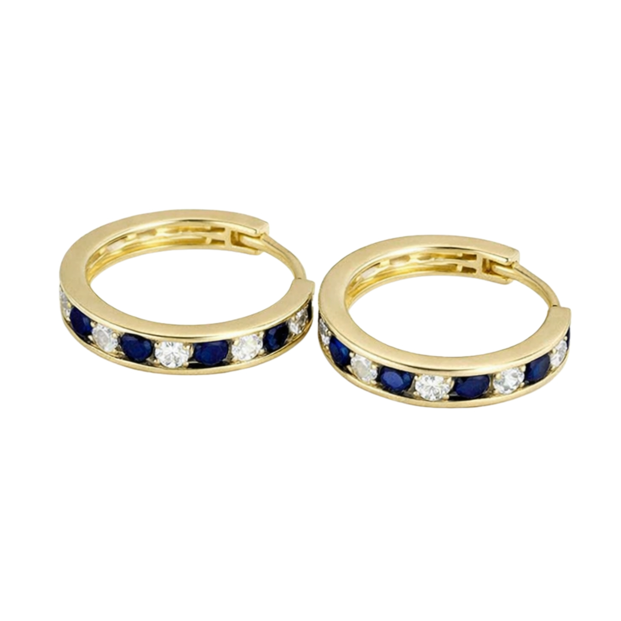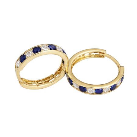 Kolczyki wykonane ze złota próby 585 w formie klasycznych kół o średnicy 1,3 cm. Front ozdobiony został naprzemiennie osadzonymi białymi oraz granatowymi cyrkoniami, które tworzą harmonijną, kontrastową kompozycję.
