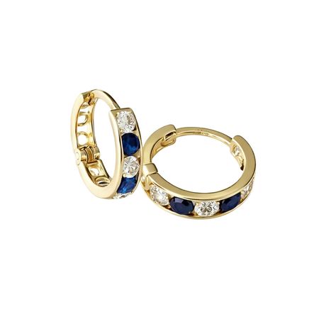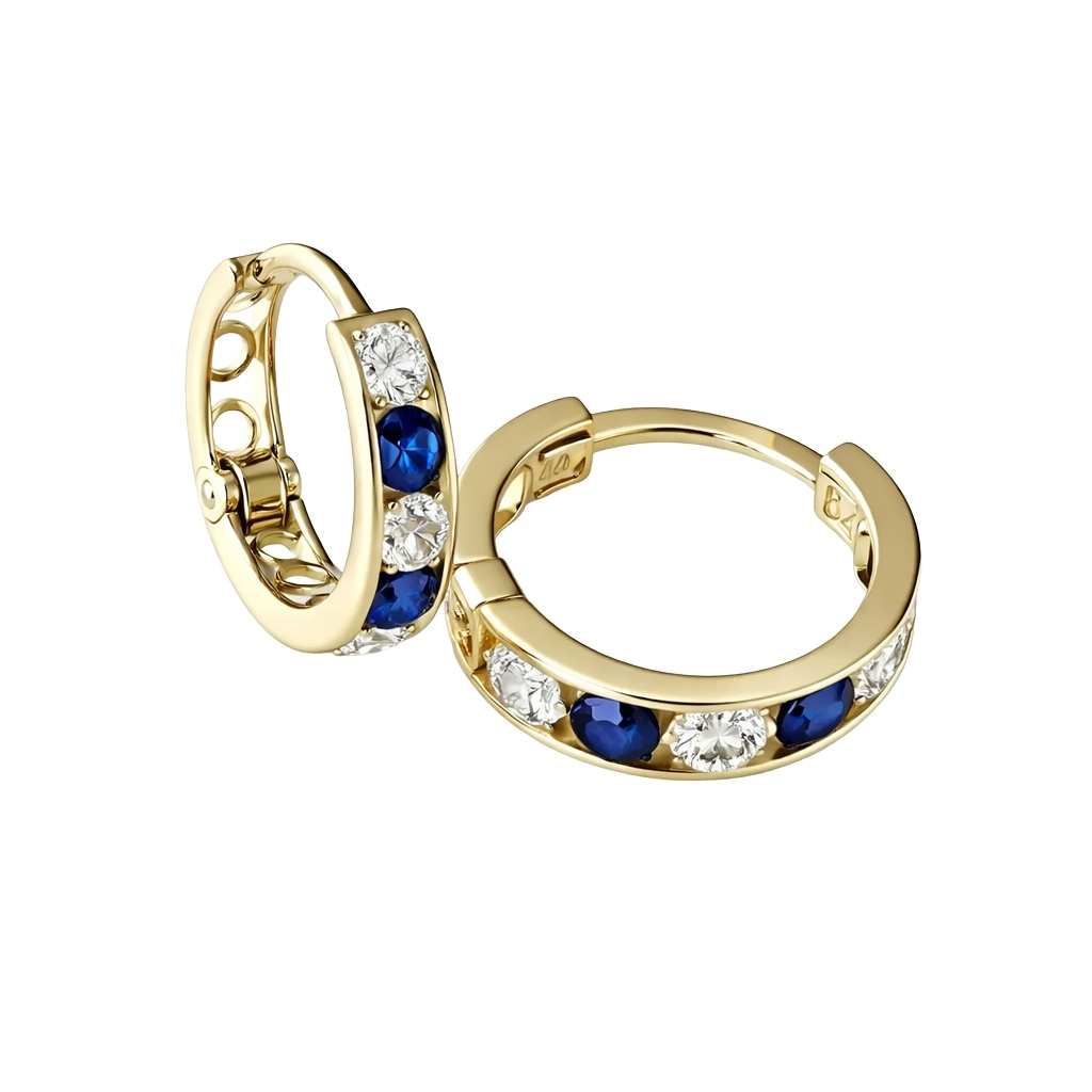 Kolczyki wykonane ze złota próby 585 w formie delikatnych, niewielkich kół. Front został ozdobiony naprzemiennie osadzonymi białymi i granatowymi cyrkoniami, które tworzą elegancki, wyrazisty kontrast na tle polerowanego złota.