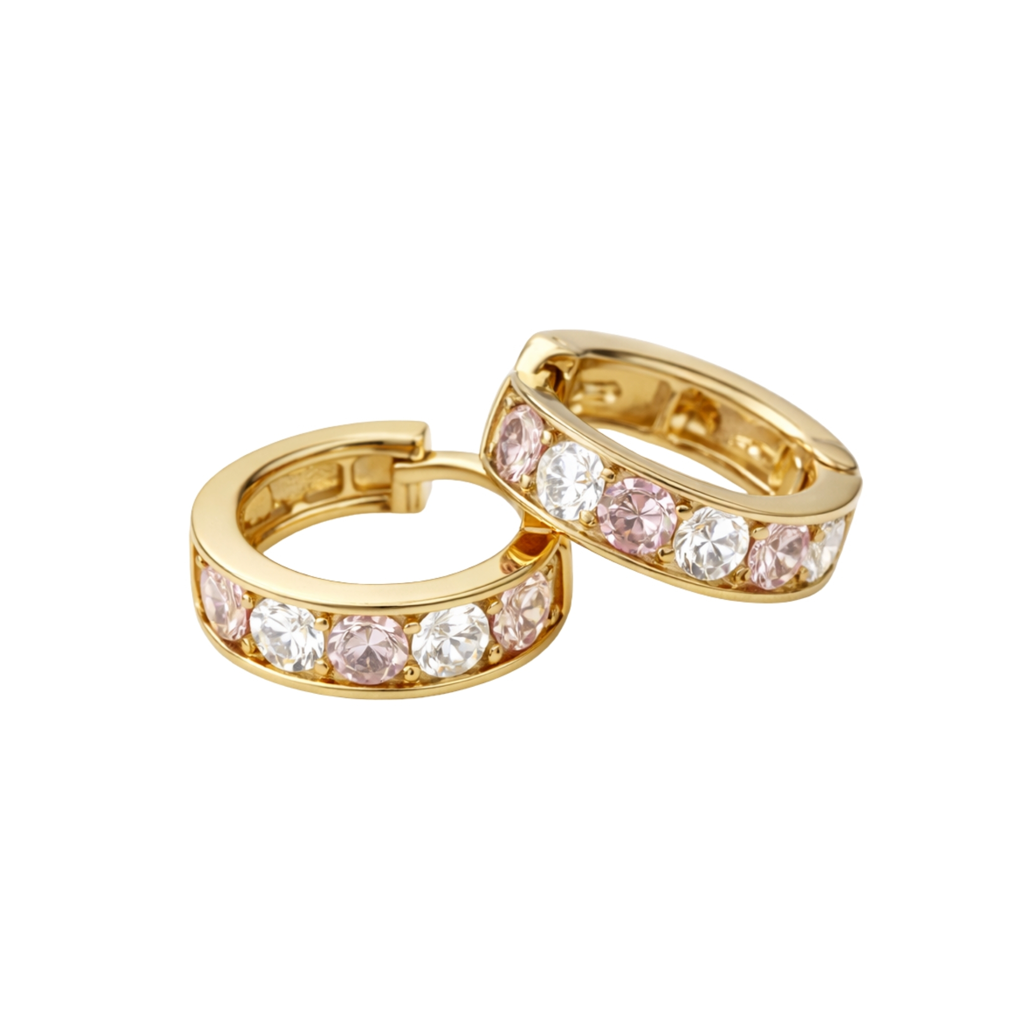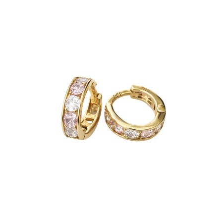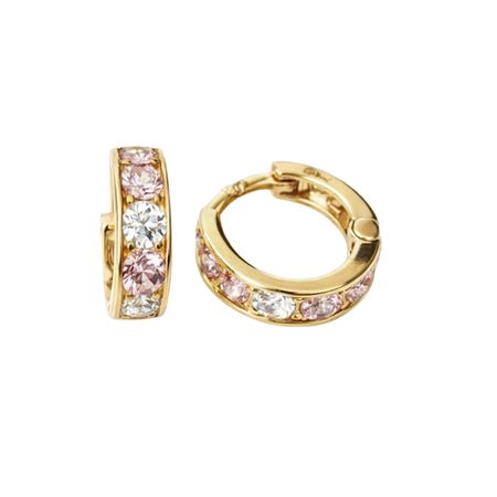 Kolczyki wykonane ze złota próby 585 w formie niewielkich kół o pełnym, gładko wykończonym profilu. Front został ozdobiony naprzemiennie osadzonymi białymi i różowymi cyrkoniami, które tworzą harmonijną, subtelną kompozycję barw.