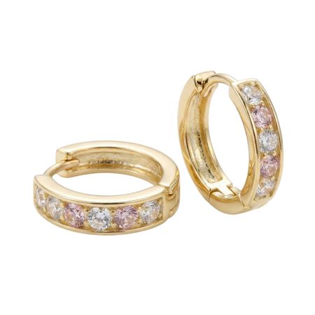 Kolczyki wykonane z żółtego złota próby 585 mają formę klasycznych kółek ozdobionych białymi i różowymi cyrkoniami. Kamienie zostały osadzone w przedniej części kolczyka, dzięki czemu pięknie odbijają światło i dodają biżuterii delikatnego blasku.