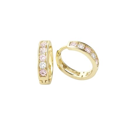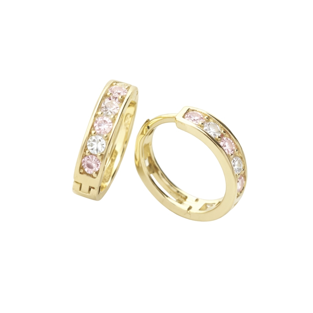 Kolczyki wykonane ze złota próby 585 w formie klasycznych kół o wyważonych proporcjach i starannie dopracowanym profilu. Przednia część została ozdobiona naprzemiennie osadzonymi białymi i różowymi cyrkoniami, które tworzą spójną kompozycję kolorystyczną. Kontrast subtelnego różu z przejrzystą bielą kamieni nadaje całości wyrazisty, ale elegancki charakter.