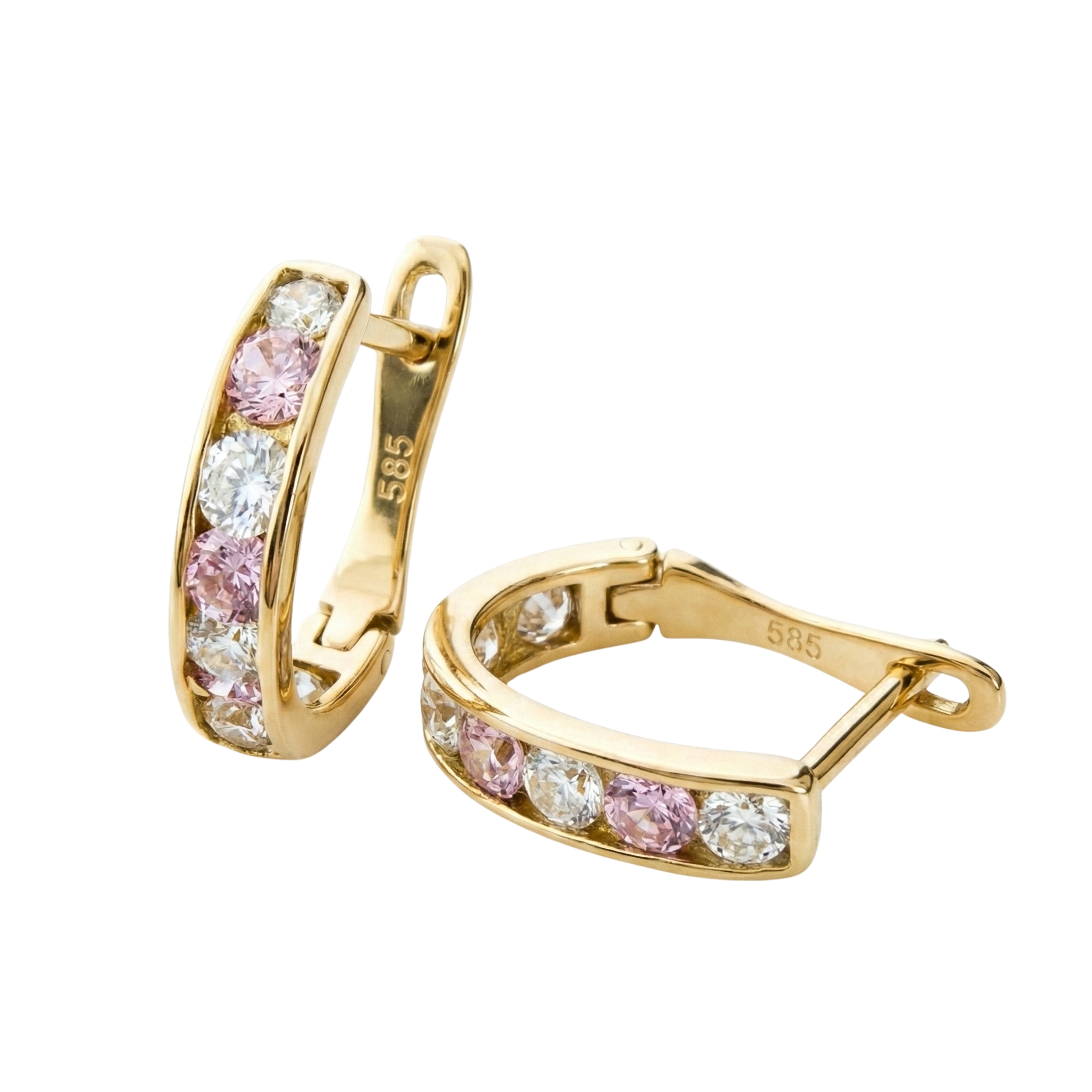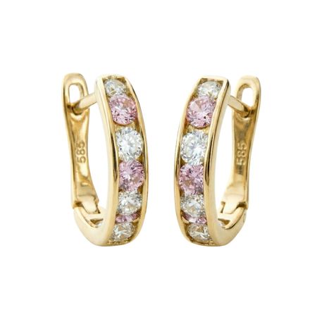 Kolczyki wykonane z żółtego złota próby 585 w formie delikatnych kółek z białymi i różowymi cyrkoniami. Kamienie zostały osadzone w przedniej części kolczyka, tworząc subtelne połączenie jasnych i pastelowych odcieni.
