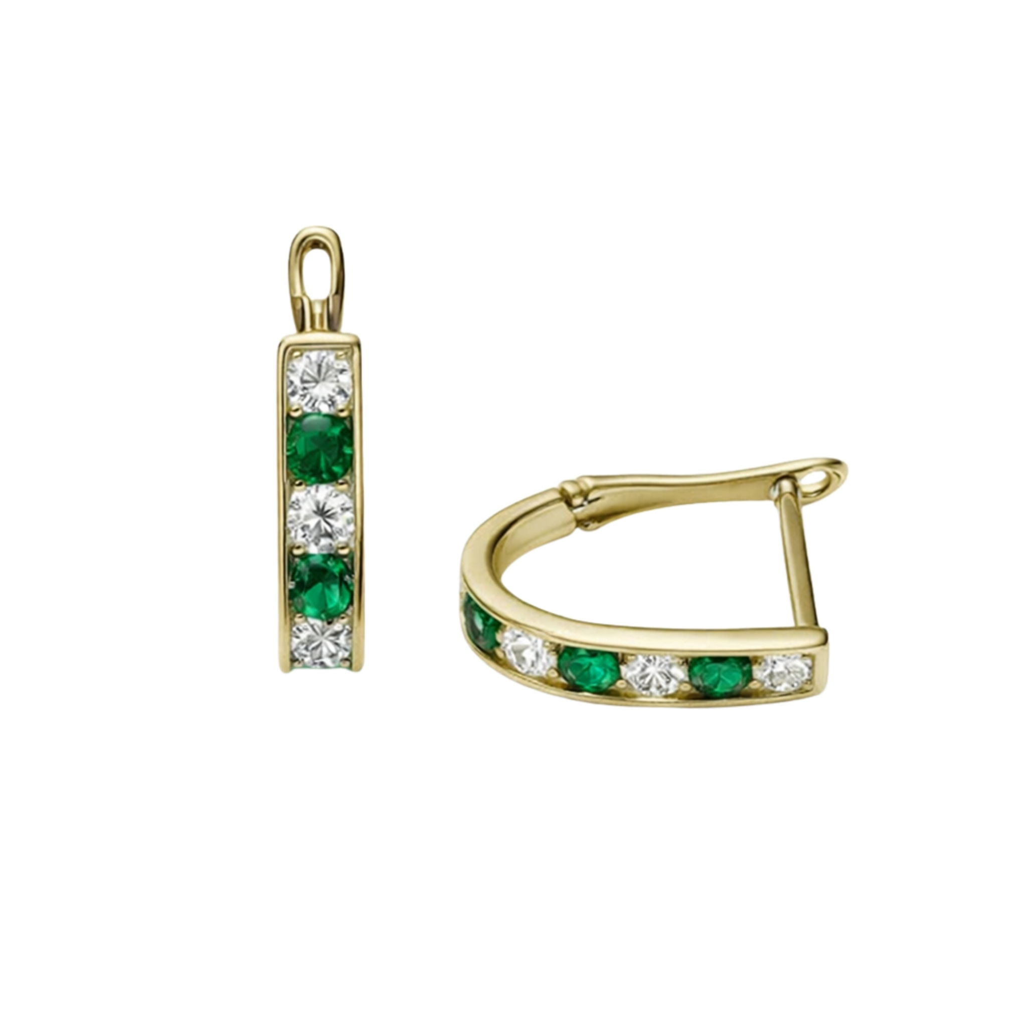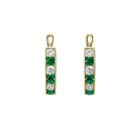 Kolczyki wykonane ze złota próby 585 o eleganckiej, zwartej formie z wyższym profilem. Front został ozdobiony naprzemiennie osadzonymi białymi i zielonymi cyrkoniami, które tworzą wyrazisty kontrast i podkreślają głębię koloru kamieni.