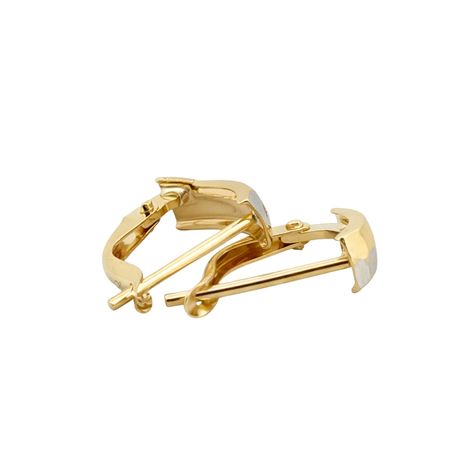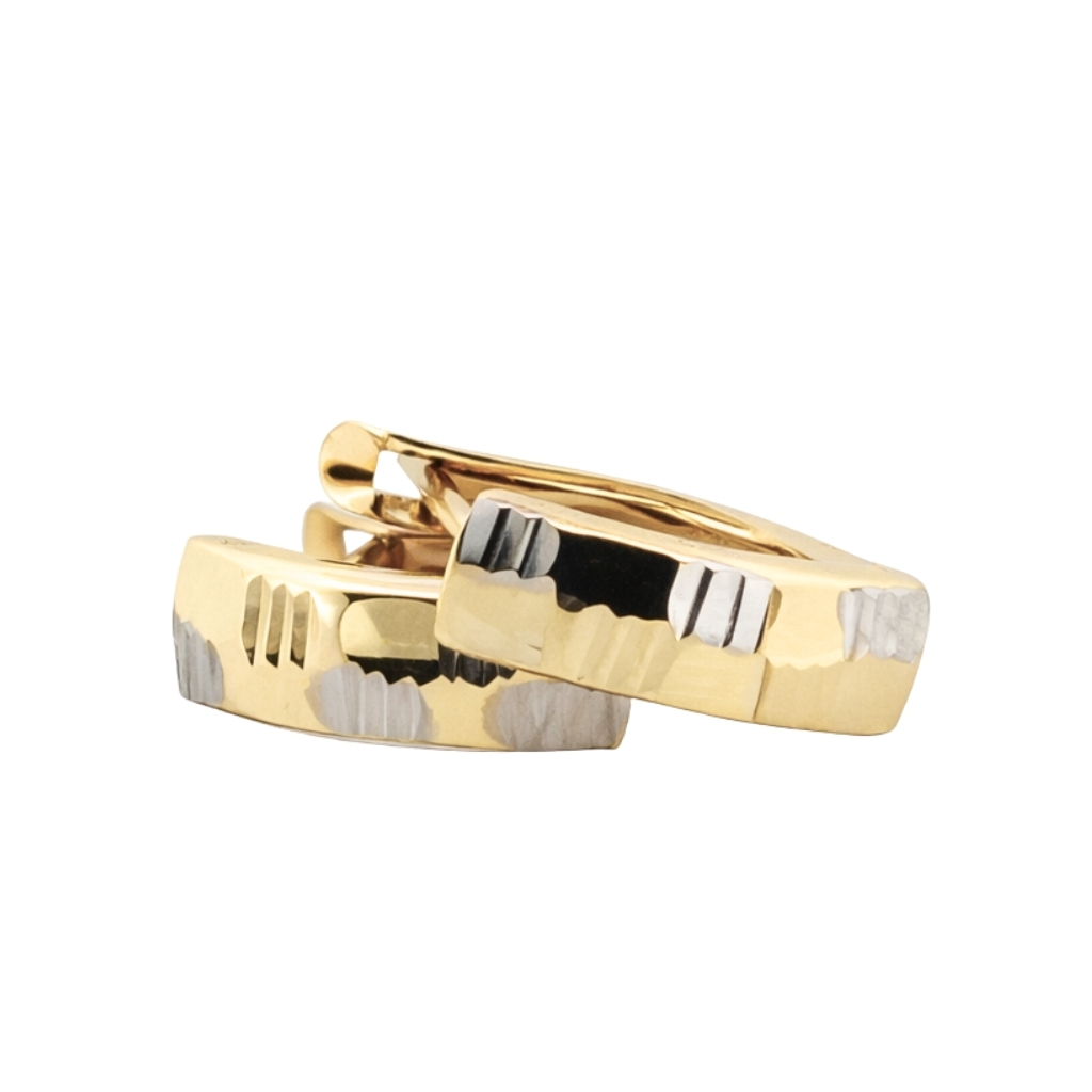 Kolczyki zostały wykonane z wysokiej jakości żółtego i białego złota próby 585 (14K). Dwukolorowe połączenie kruszcu nadaje im elegancki i nowoczesny charakter, podkreślając oryginalny design biżuterii.