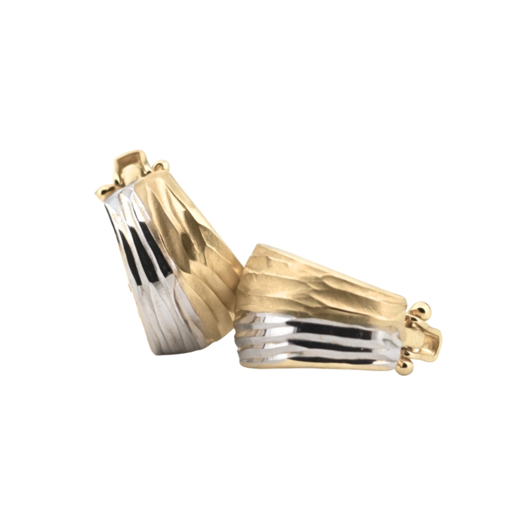 Kolczyki zostały wykonane z wysokiej jakości żółtego i białego złota próby 585 (14K). Połączenie dwóch kolorów kruszcu nadaje biżuterii elegancki i nowoczesny charakter, podkreślając jej wyjątkowy design.