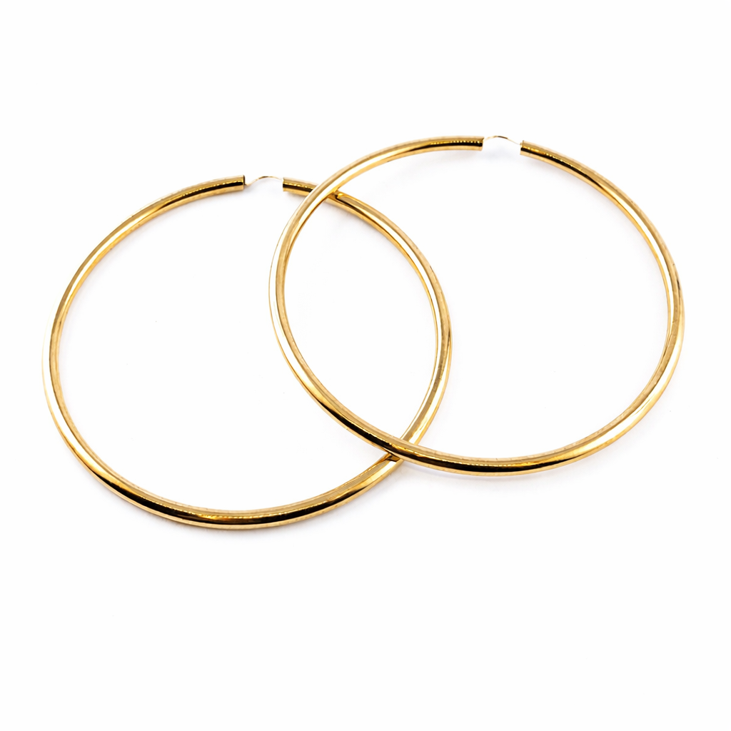 Masywne kolczyki koła wykonane ze złota próby 585 (14K). Model o wyrazistej, szerokiej formie i gładkiej, lśniącej powierzchni, która efektownie odbija światło i podkreśla głębię żółtego złota.