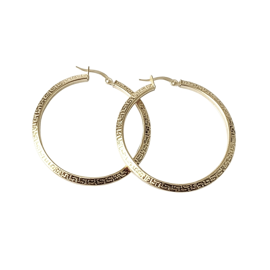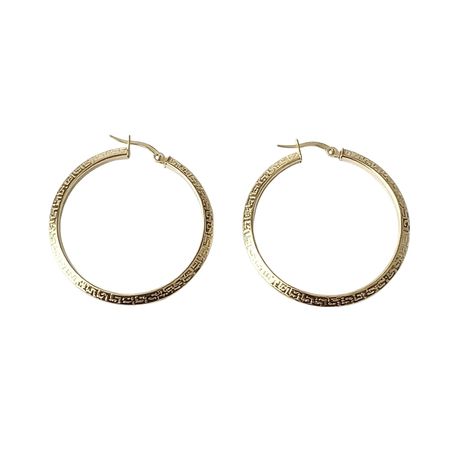 Kolczyki koła z motywem greckim wykonane ze złota pr. 585Średnica koła 2,8 cm. Kolczyki wykonane ze złota próby 585 i ozdobione greckim wzorem.