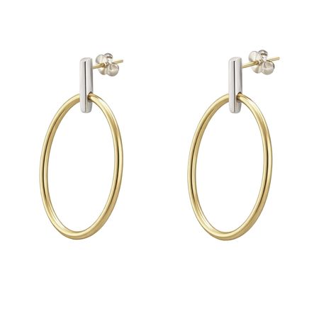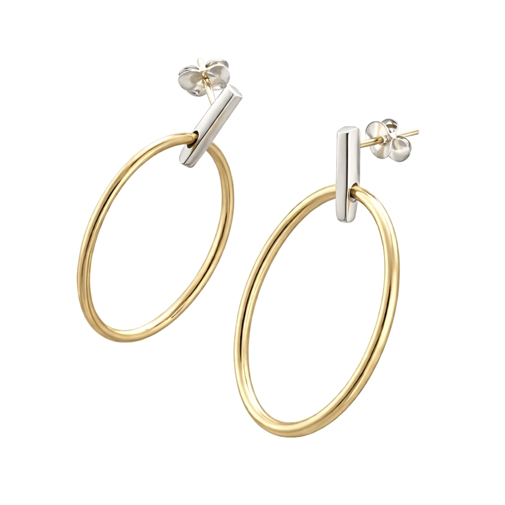 Kolczyki wykonane z połączenia żółtego i białego złota próby 585 (14K). Klasyczny owalny kształt w nowoczesnym, dwukolorowym wydaniu nadaje biżuterii elegancji i subtelnej wyrazistości. Minimalistyczna forma sprawia, że model doskonale komponuje się zarówno z codziennymi stylizacjami, jak i bardziej formalnymi zestawieniami.