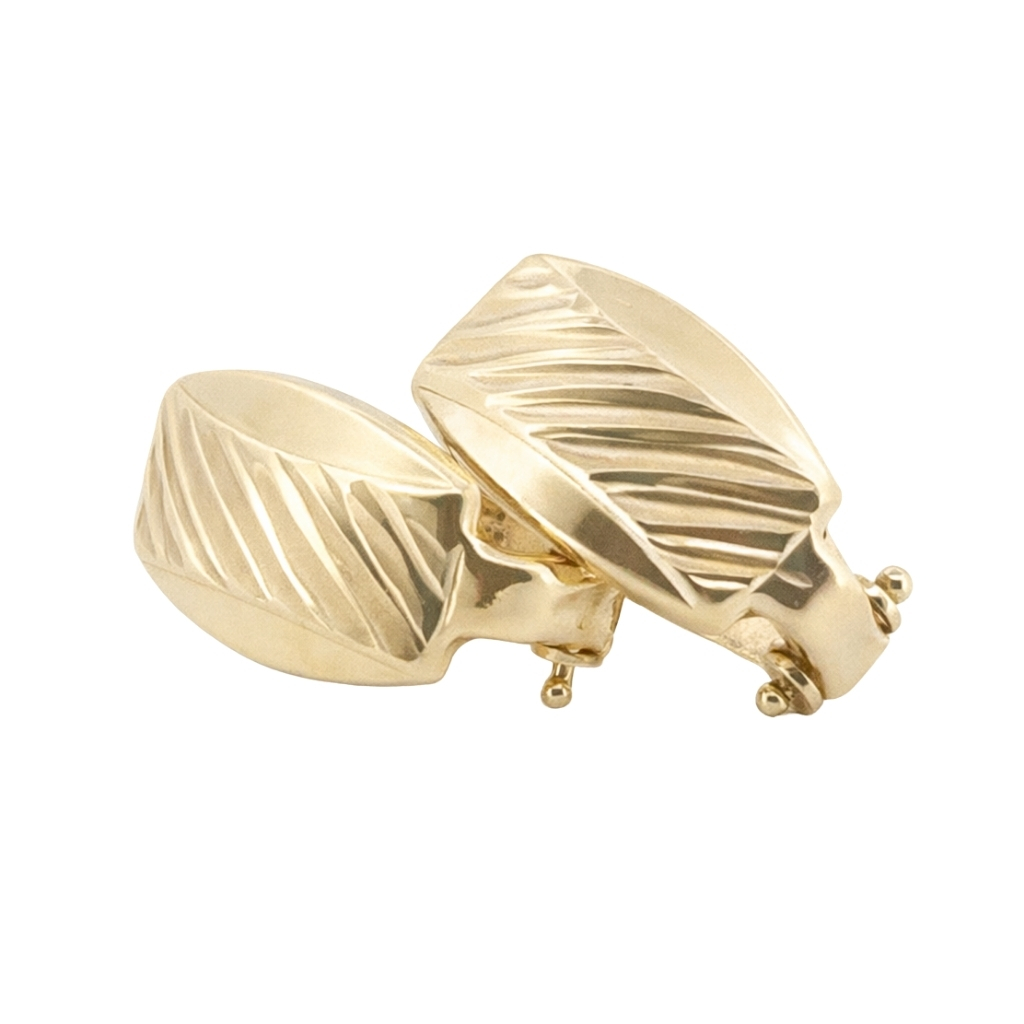 Kolczyki zostały wykonane z wysokiej jakości żółtego złota próby 585 (14K). Ich powierzchnia została ozdobiona efektownym, diamentowanym wzorem, który tworzy wyraźną, połyskującą strukturę i pięknie odbija światło.