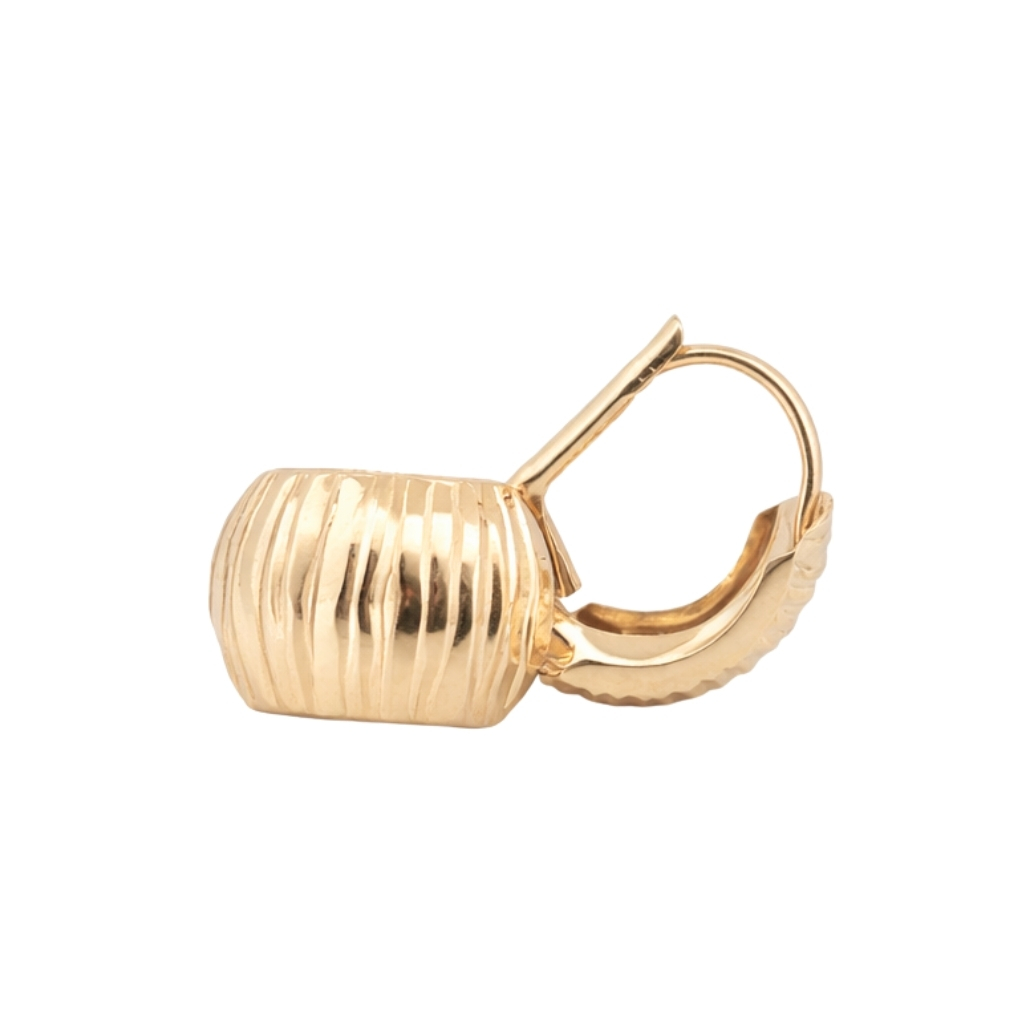 Stylowe kolczyki wykonane z wysokiej jakości złota próby 585 (14K) zachwycają subtelną formą i starannym wykończeniem. Ich powierzchnię zdobią delikatne, pionowe żłobienia, które pięknie odbijają światło i podkreślają naturalny blask złota.