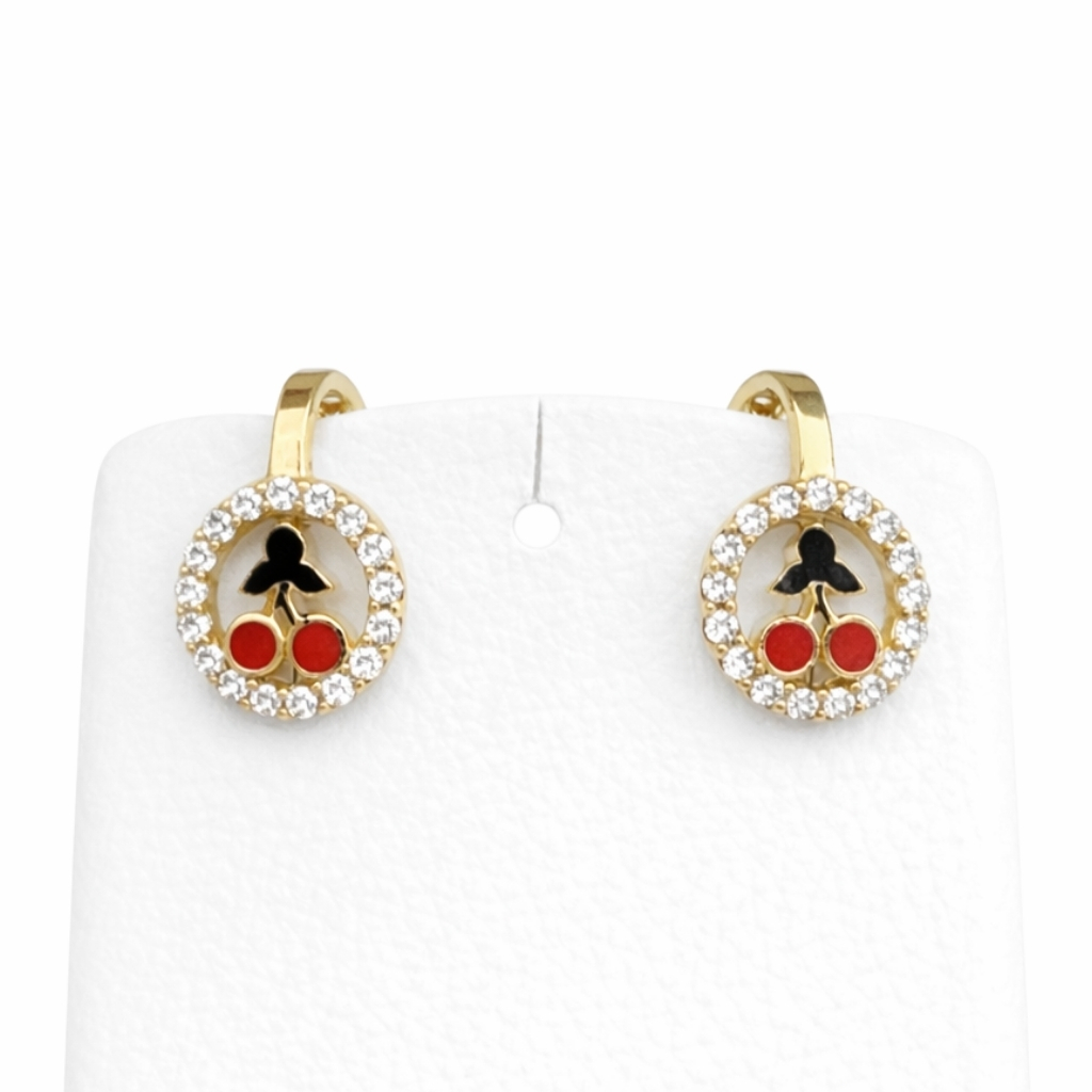 Kolczyki dziecięce zostały wykonane z wysokiej jakości żółtego złota próby 585 (14K). Uroczy motyw wisienek w połączeniu z kolorową emalią nadaje biżuterii wyjątkowego, radosnego charakteru, idealnego dla najmłodszych.