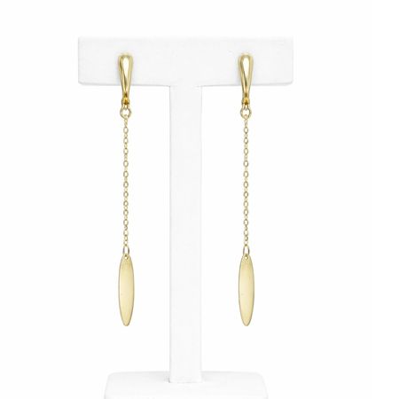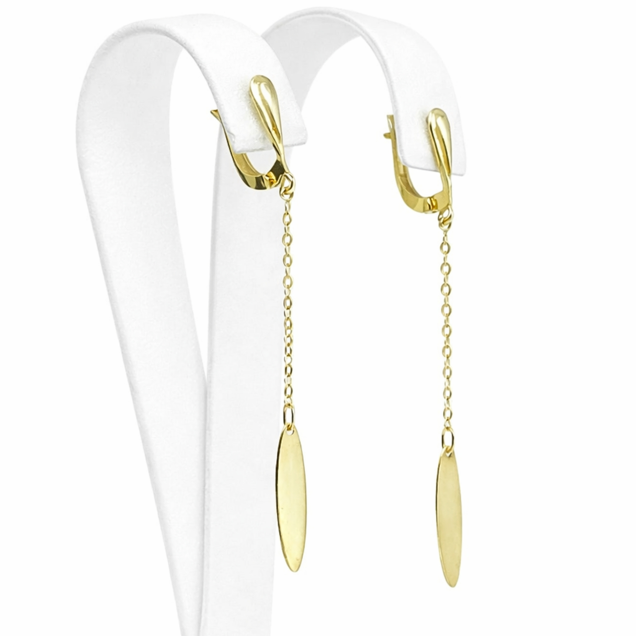Złote kolczyki wiszące wykonane z wysokiej jakości złota próby 585 (14K). Model składa się z delikatnego łańcuszka zakończonego smukłym, podłużnym elementem o gładkiej, polerowanej powierzchni. Prosta, minimalistyczna forma sprawia, że kolczyki prezentują się lekko i subtelnie, a przy każdym ruchu pięknie odbijają światło.