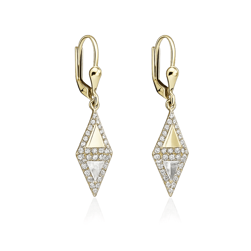 Złote kolczyki wiszące o nowoczesnym, geometrycznym wzorze w kształcie rombów, wykonane z wysokiej jakości złota próby 585 (14K). Centralny element stanowi przestrzenna forma rombu, której powierzchnia została ozdobiona drobnymi cyrkoniami, nadającymi całości wyrafinowanego blasku.