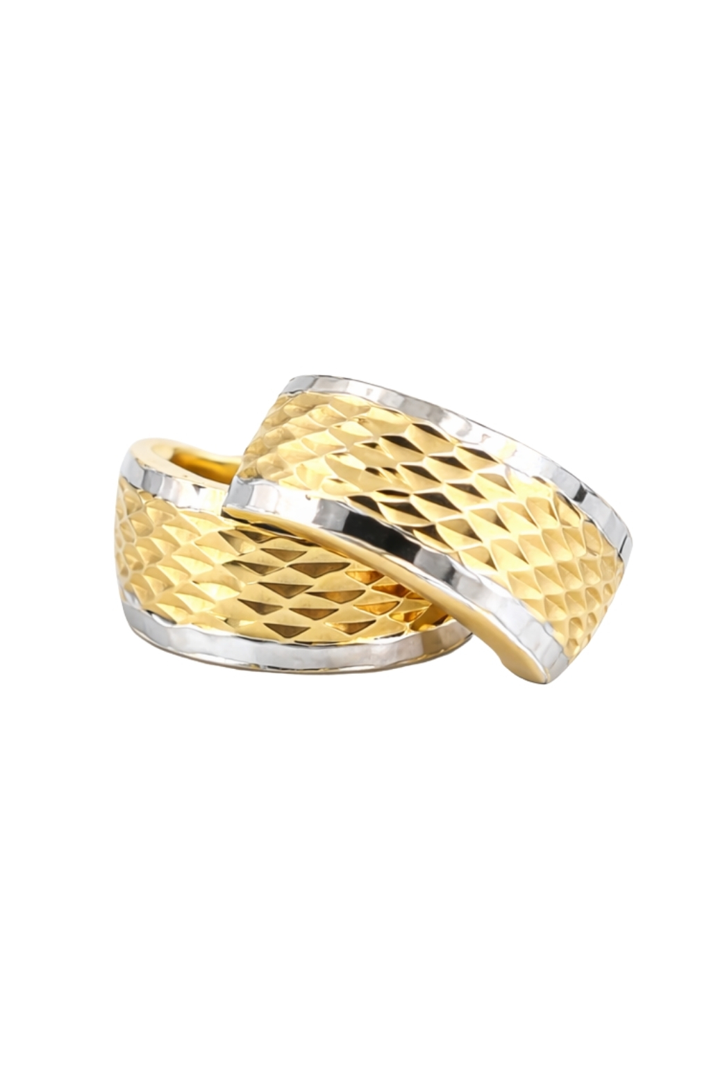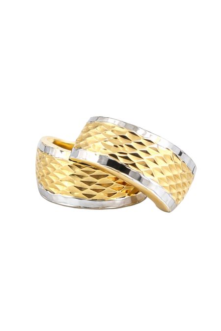 Kolczyki zostały wykonane z wysokiej jakości żółtego i białego złota próby 585 (14K). Dwukolorowa kompozycja nadaje biżuterii wyjątkowej estetyki. Powierzchnia została ozdobiona efektownym, diamentowanym wzorem, który tworzy delikatną, połyskującą strukturę.