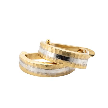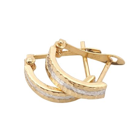 Kolczyki zostały wykonane z wysokiej jakości żółtego oraz białego złota próby 585 (14K). Dwukolorowa kompozycja nadaje biżuterii eleganckiego i nowoczesnego charakteru. Powierzchnia została ozdobiona subtelną, nieregularną fakturą, która pięknie odbija światło i nadaje biżuterii wyjątkowej głębi.