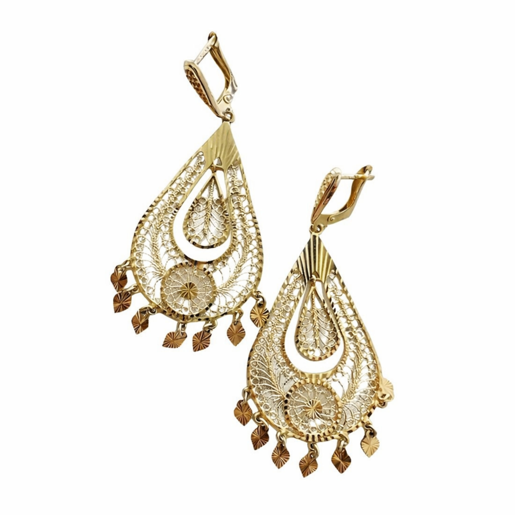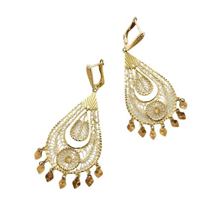 Duże kolczyki wykonane w całości z żółtego złota próby 585 to efektowna propozycja dla kobiet, które lubią wyrazistą biżuterię. Mają formę ażurowej kropli z bogatymi, dekoracyjnymi zdobieniami oraz ruchomymi elementami w dolnej części, które nadają im lekkości.