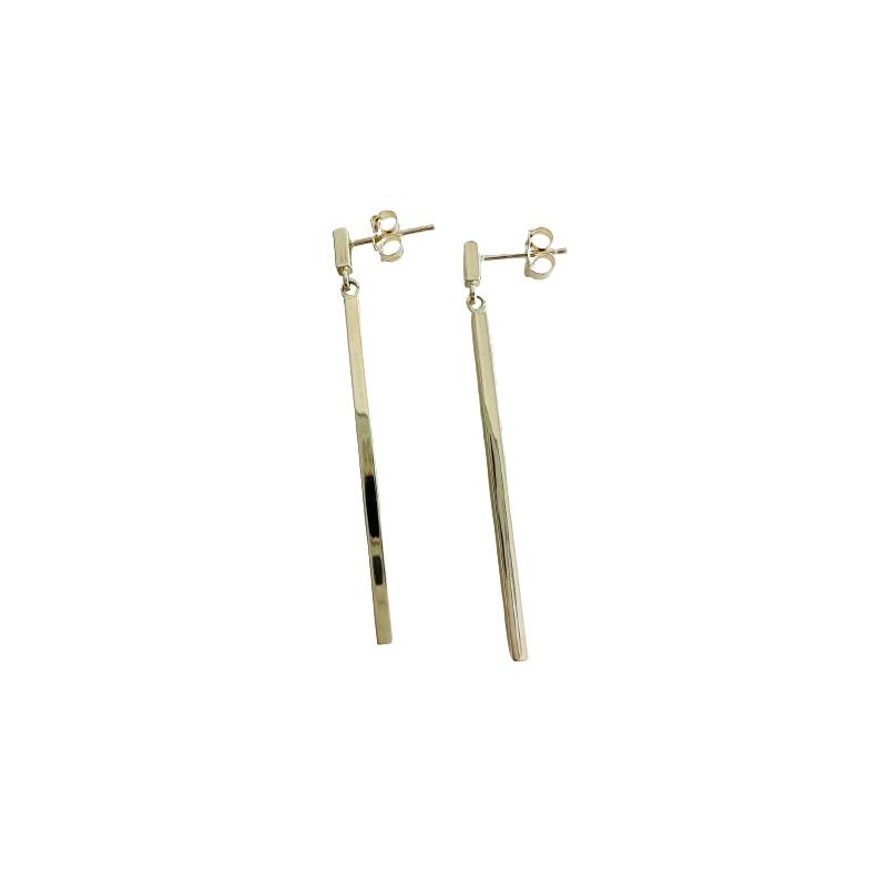 Piękne kolczyki wykonane w całości z żółtego złota pr. 585. Kolczyki zapinane na sztyft, składające z krótszego i dłuższego słupka. Nikt obok nich  nie przejdzie obojętnie. Idealne uzupełnienie codziennej oraz formalnej  stylizacji.
