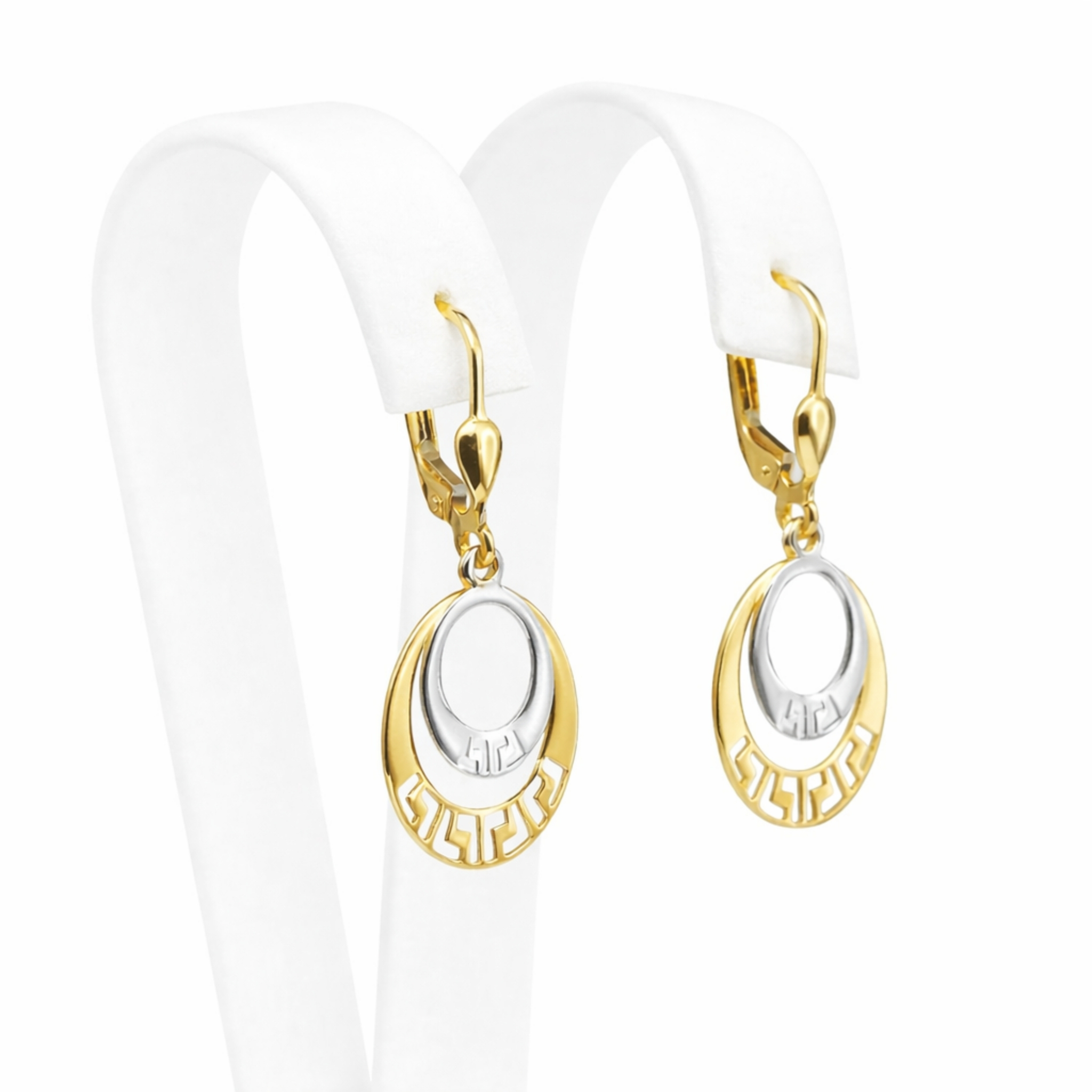 Centralną część stanowi gładki, polerowany owal w białym złocie, otoczony złotą ramą zdobioną motywem drogi greckiej. Ten ponadczasowy ornament nadaje biżuterii charakteru i subtelnej dekoracyjności, podkreślając jej wyjątkowy styl.