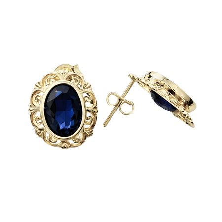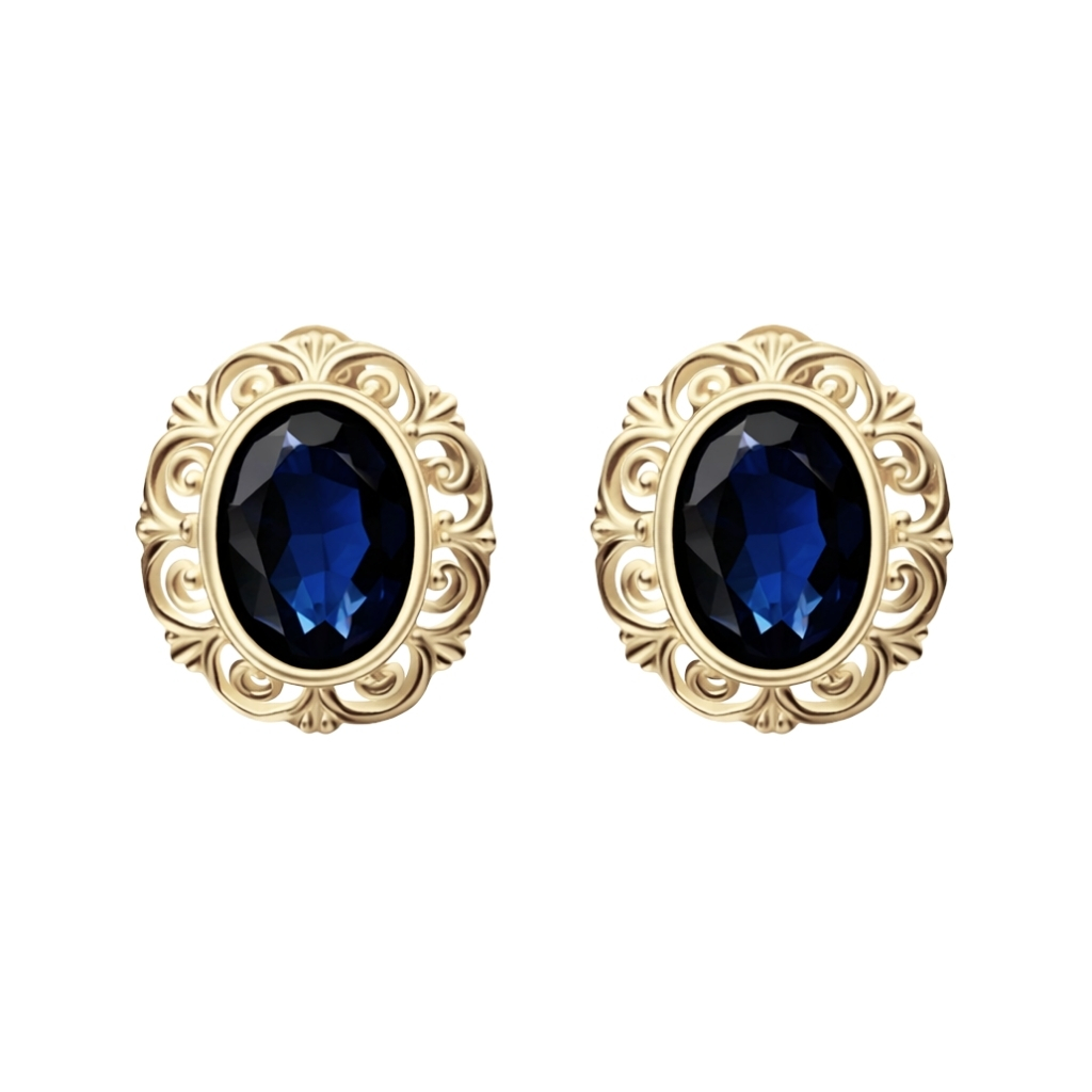 Eleganckie kolczyki wykonane z wysokiej jakości żółtego złota próby 585 (14K), zapinane na wygodny i bezpieczny sztyft. Centralnym punktem kompozycji jest intensywnie granatowe oczko, które pięknie kontrastuje ze złotą, ozdobnie wykończoną oprawą.