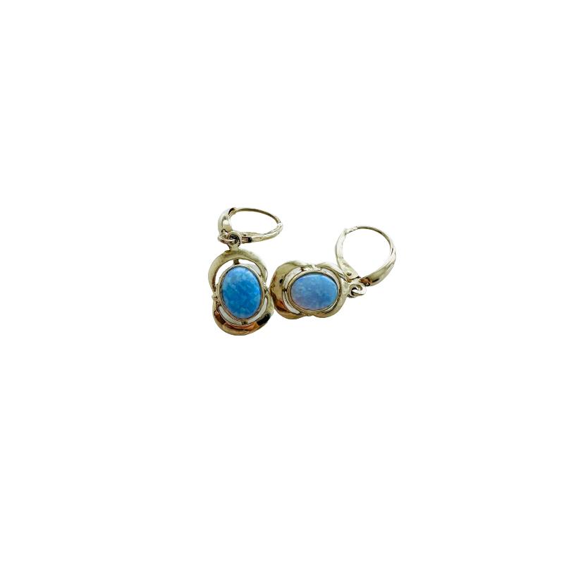 Piękne kolczyki wykonane w całości z żółtego złota pr. 585. Kolczyki z wygonym zapięciem angielskim, z centralnie osadzonym niebieskim oczkiem, które pięknie mieni się w świetle dziennym. Biżuteria, która pięknie dopełni jasne letnie stylizacje.