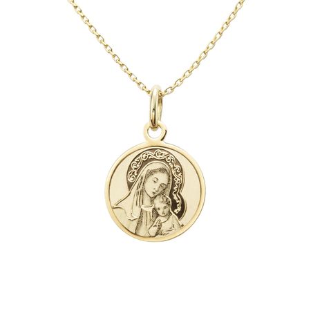 W skład zestawu wchodzi klasyczny łańcuszek o splocie ankier oraz elegancki medalik przedstawiający Matkę Bożą z Dzieciątkiem.
