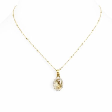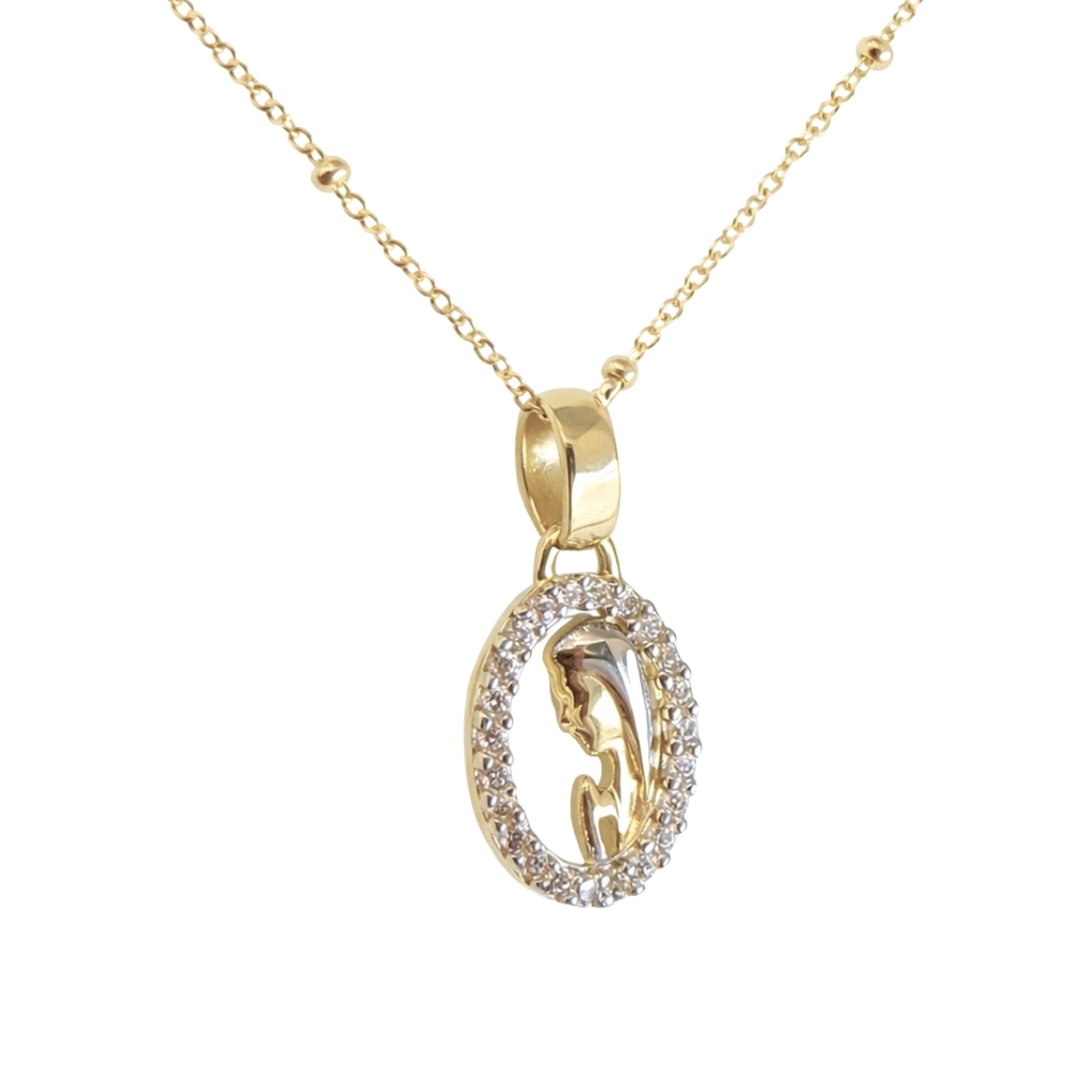 W skład kompletu wchodzi delikatny łańcuszek o splocie rolo z ozdobnymi kuleczkami, który pięknie układa się na szyi i podkreśla lekkość całej kompozycji. Dopełnieniem jest medalik z żółtego i białego złota. Przedstawia on wizerunek Matki Bożej ozdobiony lśniącymi cyrkoniami, które subtelnie odbijają światło i dodają całości wyjątkowego blasku.