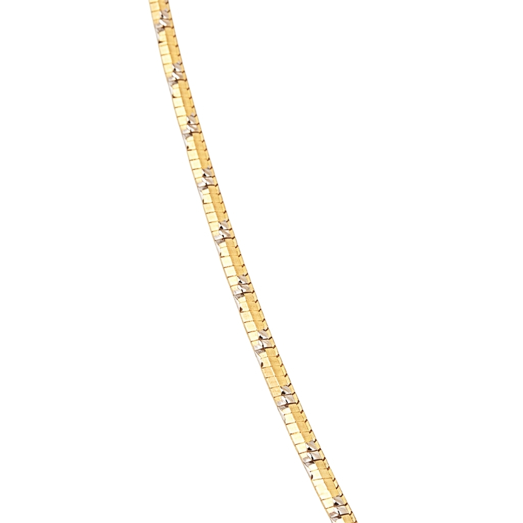 Łańcuszek został wykonany z żółtego i białego złota próby585 (14K). Splot typu żmijka charakteryzuje się gładką, zwartą i elastycznąstrukturą, która tworzy efekt jednolitej, płynnej formy.