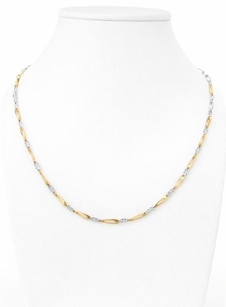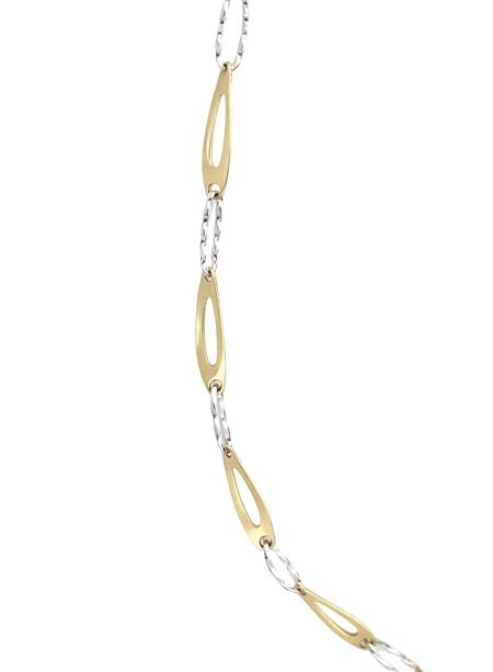 Elegancki łańcuszek wykonany z wysokiej jakości żółtego i białego złota próby 585 (14K). Połączenie kontrastujących barw nadaje biżuterii wyjątkowego charakteru oraz sprawia, że całość prezentuje się niezwykle efektownie i nowocześnie.