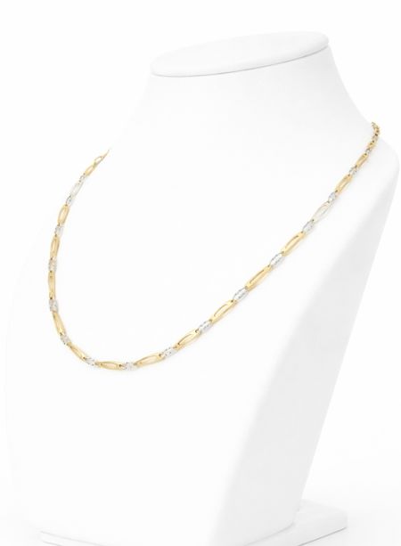 Produkt wyróżnia się ozdobnym splotem o naprzemiennych elementach, w którym wydłużone złote ogniwa przeplatają się z delikatnie skręconymi ogniwami z białego złota. Taka kompozycja tworzy dekoracyjny, biżuteryjny splot o charakterze ozdobnym, który sam w sobie stanowi efektowną ozdobę szyi.