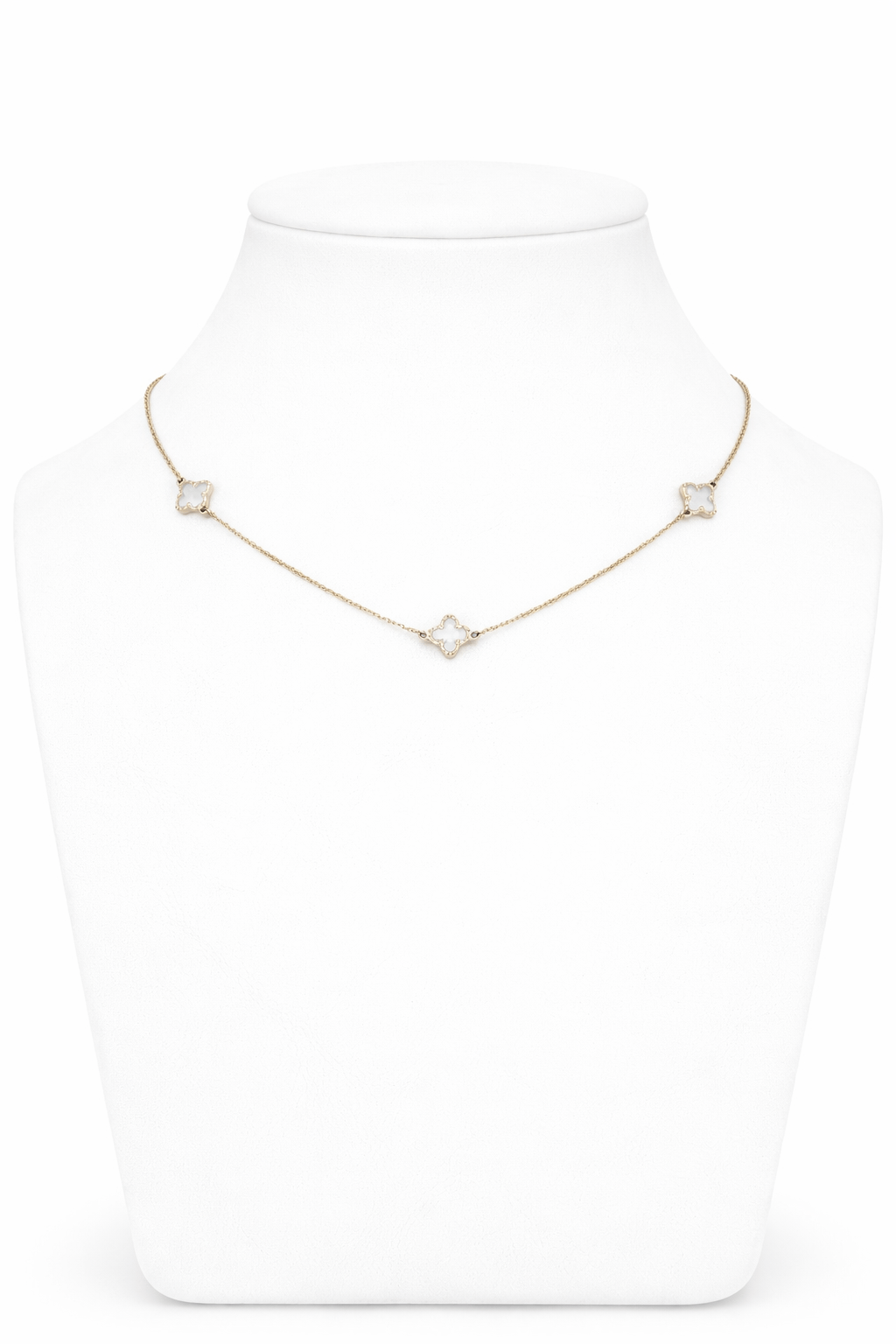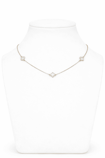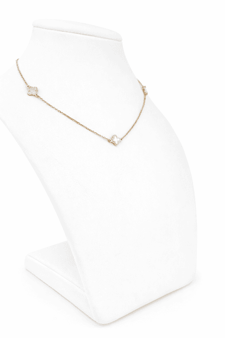 Łańcuszek został wykonany z wysokiej jakości żółtego złota o próbie 585 (14K). Ma delikatną, ozdobną formę, uzupełnioną dekoracyjnymi elementami w kształcie koniczyn rozmieszczonymi na jego długości. Całość prezentuje się lekko i subtelnie, zachowując estetyczny i elegancki wygląd.