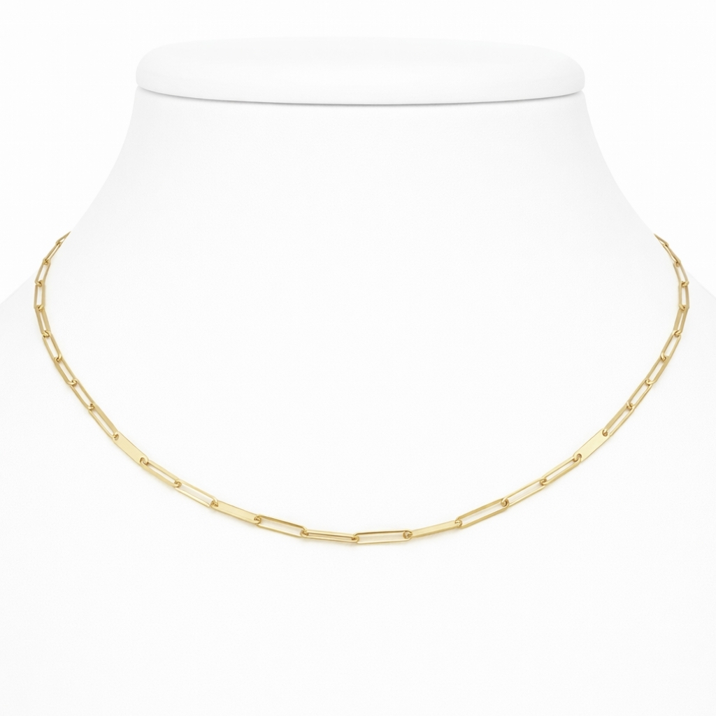 Łańcuszek został wykonany z żółtego złota próby 585 (14K). Splot typu ankier, składający się z wydłużonych, regularnych ogniw, został uzupełniony o subtelne, gładkie blaszki, które nadają całości nowoczesnego i wyjątkowego charakteru.