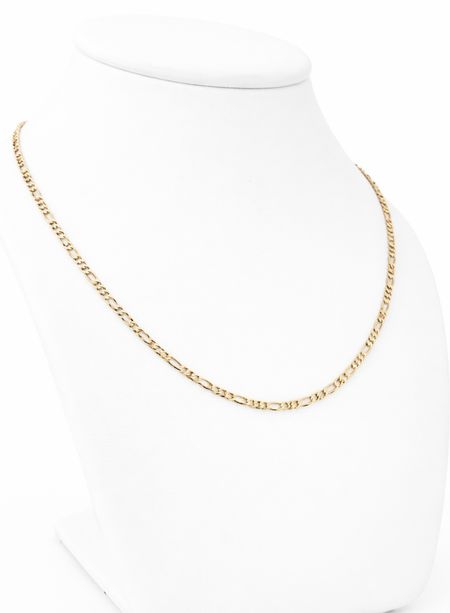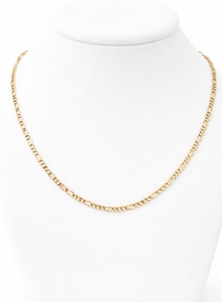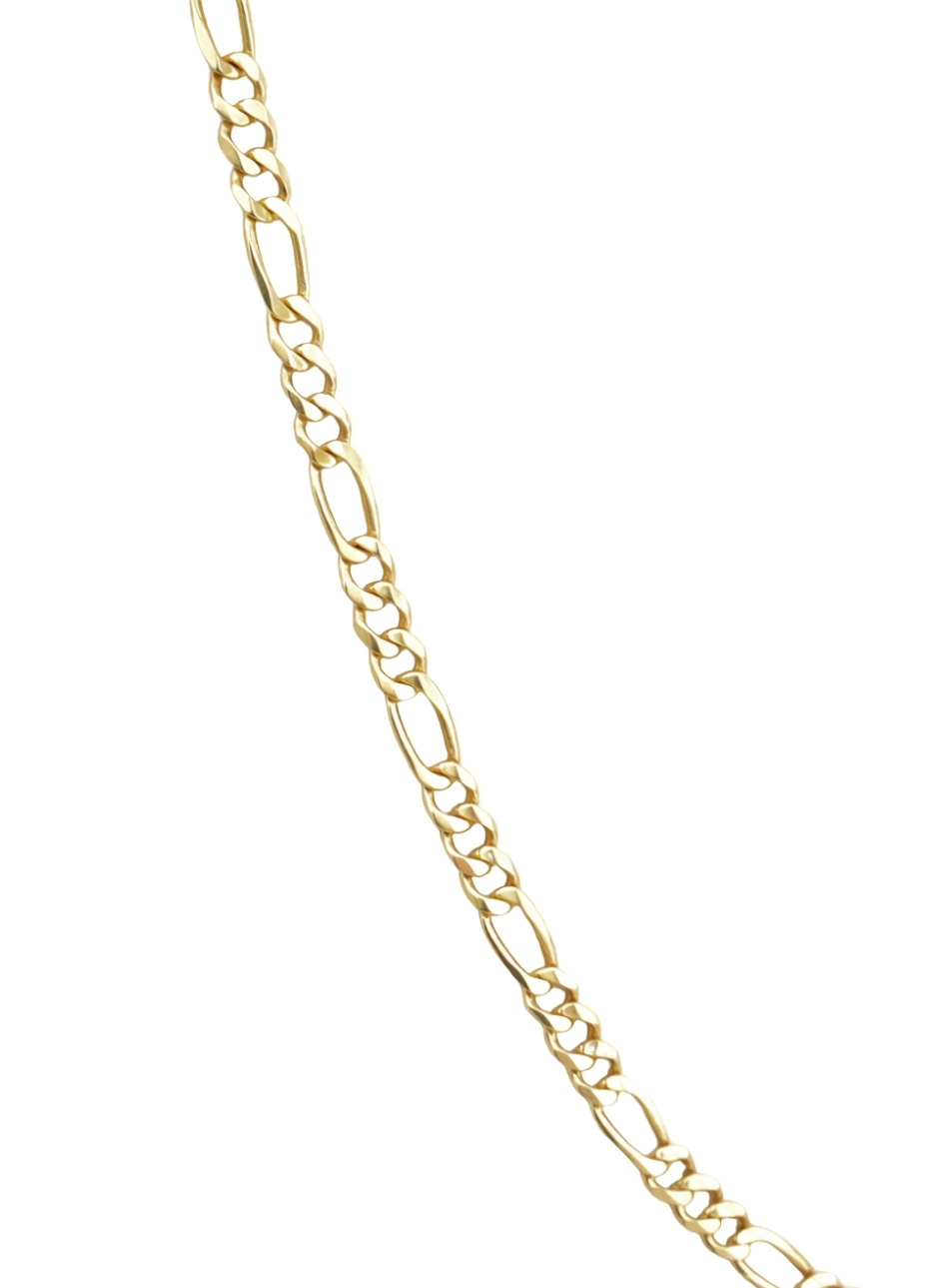 Łańcuszek został wykonany ze złota próby 585 (14K). Charakterystyczny splot figaro wyróżnia się naprzemiennym układem krótszych i dłuższych ogniw, co nadaje biżuterii elegancki oraz wyrazisty wygląd. Starannie wypolerowana powierzchnia podkreśla naturalny blask złota i sprawia, że subtelnie odbija światło.