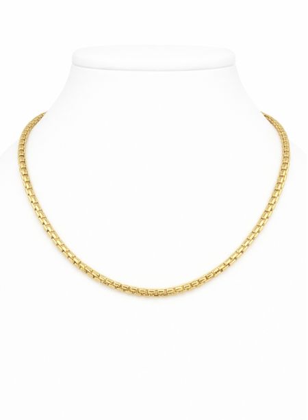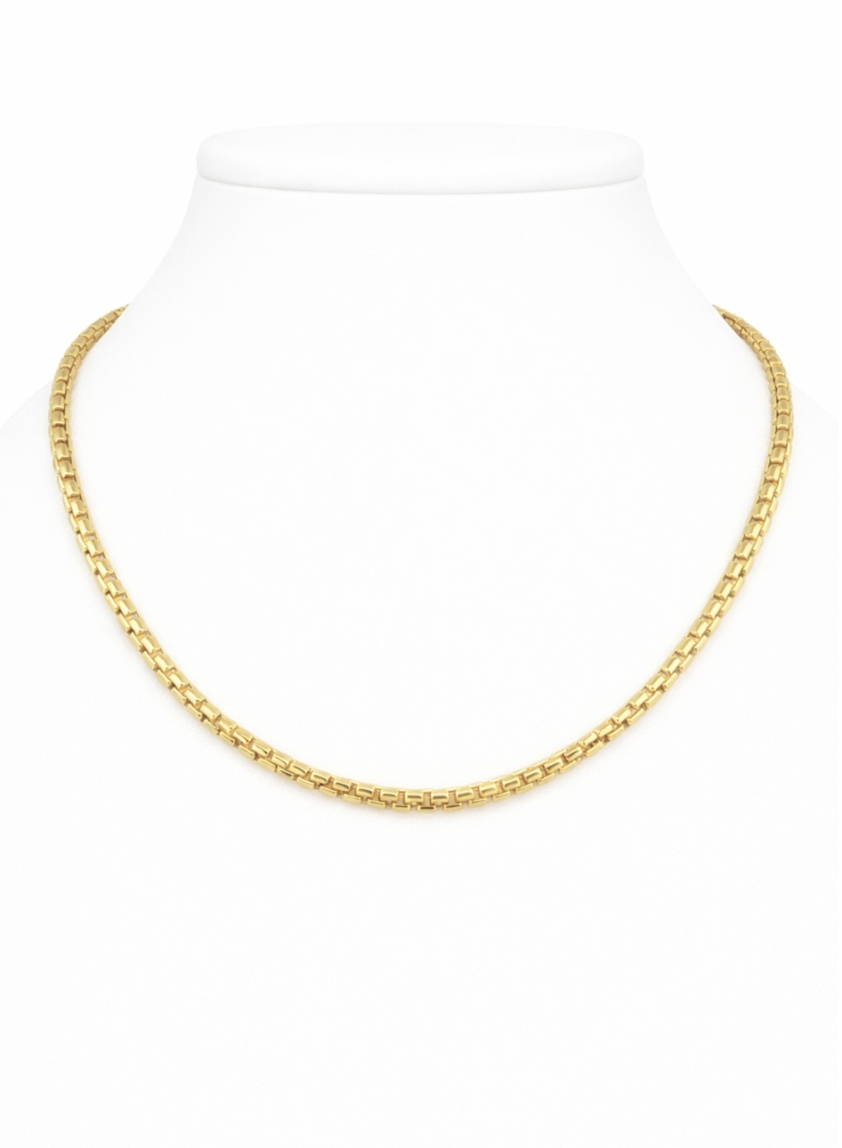 Łańcuszek o splocie kostka wenecka został wykonany ze złota próby 585. Regularnie ułożone, geometryczne ogniwa tworzą zwartą, elegancką strukturę o wyrazistym, nowoczesnym charakterze. Precyzyjna forma nadaje biżuterii harmonijny wygląd oraz podkreśla jej szlachetny styl.