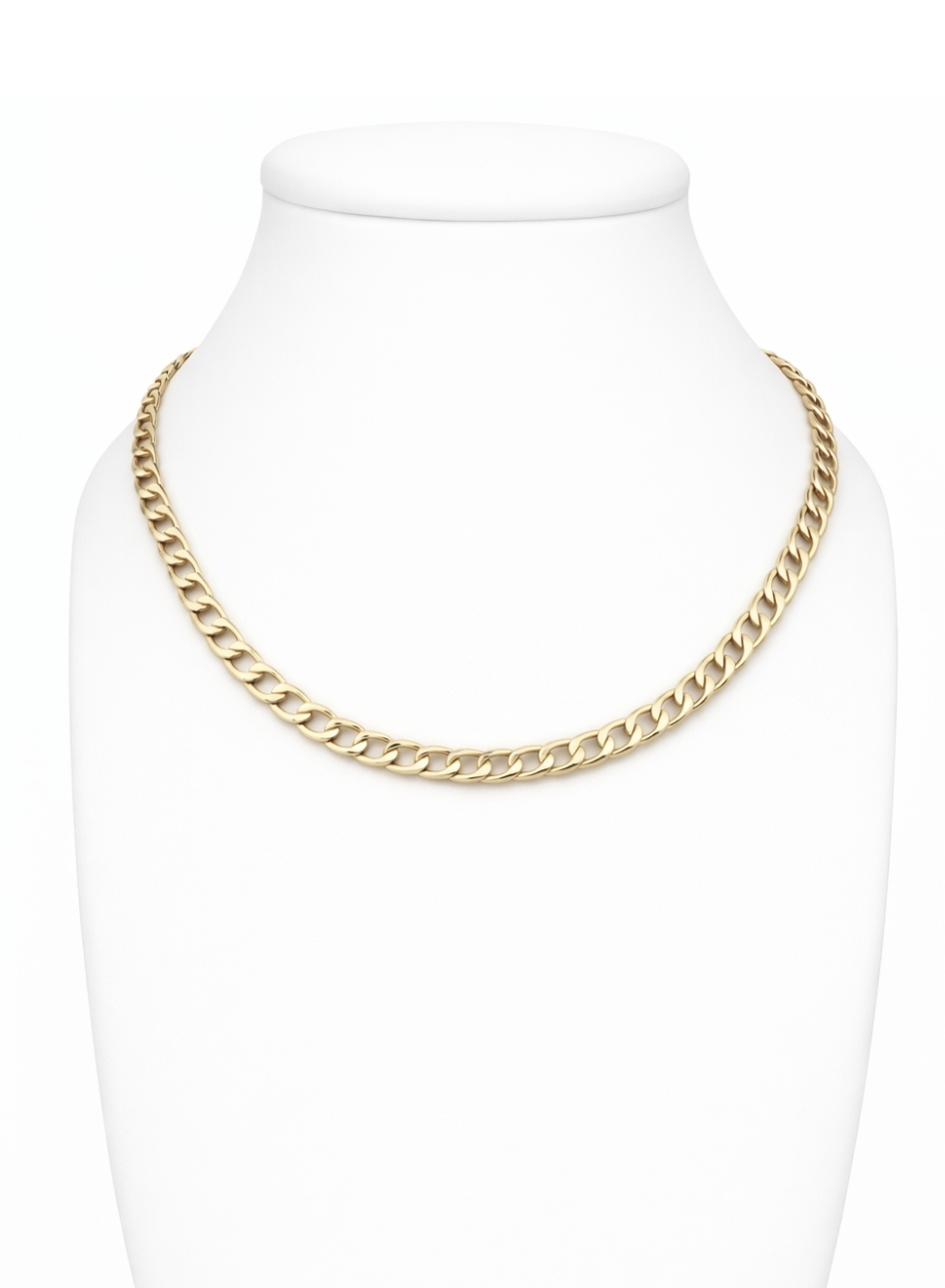Łańcuszek o klasycznym splocie pancerka został wykonany ze złota próby 585 (14K). Charakterystyczne, lekko spłaszczone ogniwa o gładkiej, polerowanej powierzchni zostały precyzyjnie zespolone, tworząc zwartą i harmonijną strukturę, a ich regularny układ nadaje całości wyrazisty, elegancki charakter.