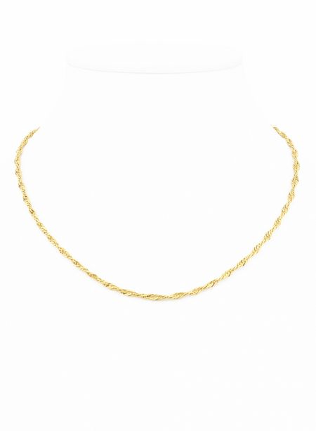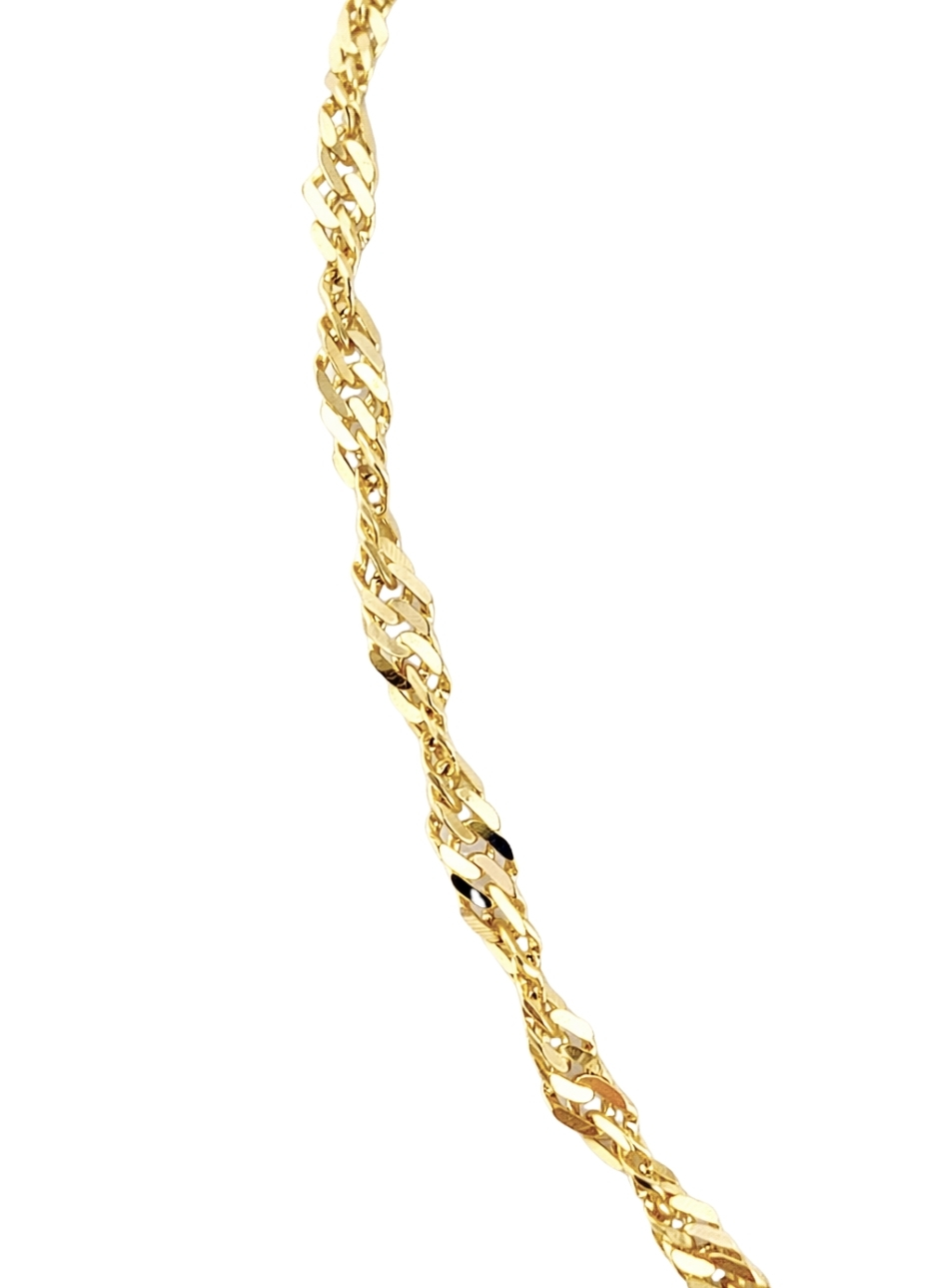 Łańcuszek o splocie singapur został wykonany ze złota próby 585 (14K). Charakterystycznie skręcone, precyzyjnie ułożone ogniwa tworzą efektowną, spiralną strukturę, która pięknie odbija światło i nadaje biżuterii dynamiczny, elegancki charakter.