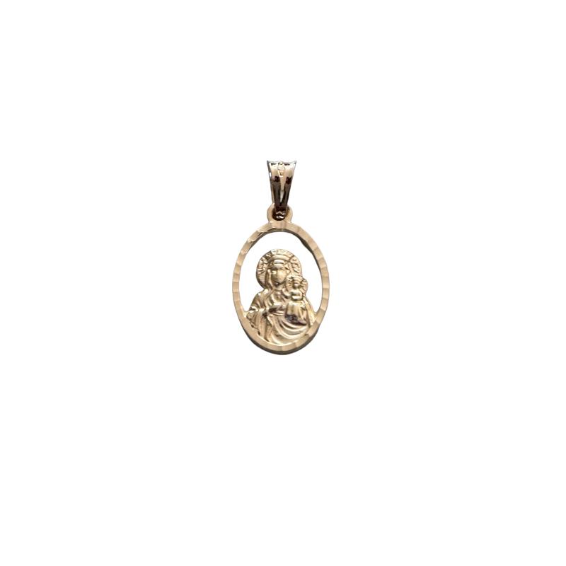 Piękny, niecodzienny medalik z  Matką Boską Częstochowską, wykonany ze złota pr.585. Wizerunek Matki Boskiej z Dzieciątkiem umieszczono w błyszczącej ramce.